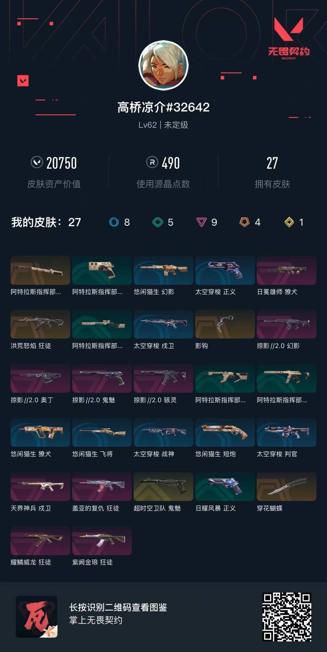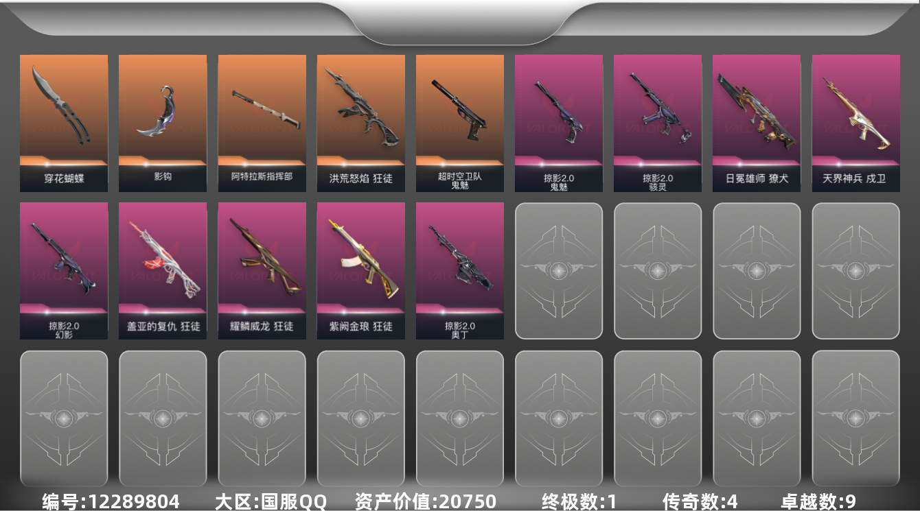 [12289804]4橙皮 1金皮 9紫皮 27皮肤 16英雄 48卡面 490已用源晶 未定级 优质装备:狂徒-紫阙金琅,狂徒-盖亚的复仇,狂徒-洪荒怒焰,戍卫-天界神兵,狂徒-耀鳞威龙,穿花蝴蝶,阿特拉斯指挥部,影钩,獠犬-日冕雄师 套装:掠影2.0套装 佩枪皮肤:鬼魅-超时空卫队,鬼魅-掠影2.0 冲锋枪皮肤:骇灵-掠影2.0 步枪皮肤:幻影-掠影2.0 机枪皮肤:奥丁-掠影2.0