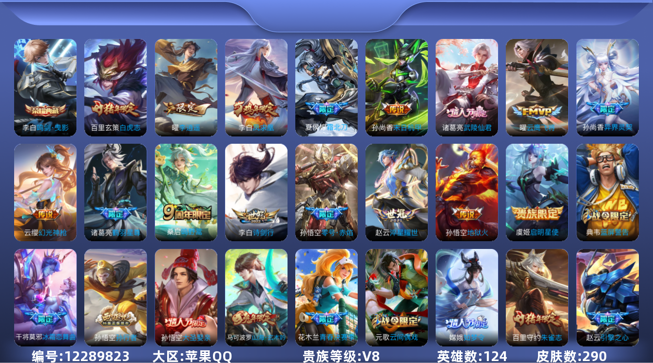 [12289823]V8 1典藏 16传说 124英雄 290皮肤 可修改实名 优质装备:鸣剑·曳影,云鹰飞将(小将军),末日机甲-孙尚香(绿蚂蚱),地狱火,零号·赤焰,李逍遥,淬星耀世,鹤羽星尊 传说皮:幻光神枪 珍宝阁皮:女武神,玩趣恶龙 限定皮:逐霄战戟,陌上桑,鸣野蒿,夏侯惇霜北刀,白虎志(电光耗子),凤求凰(白切鸡),武陵仙君(小桃花),异界灵契(白毛香),飞衡(韩信年限),高山流水,诗剑行,五谷丰年,游园惊梦,梁祝,天狼狩猎者,天狼溯光者,李小龙,朱雀志(守约年限),如梦令-嫦娥,如梦令-后羿,孙行者,一生所爱,大圣娶亲,引擎之心,青春决赛季,冰霜恋舞曲,山海·玄木吟(马可年限) 史诗皮:谪仙醉月,破空之剑,紫霞仙子,苍穹之光,电玩小子(小书包),白龙吟,黄金分割率,特工魅影,千年之狐,江河有灵,魅语,冰冠公主,偶像歌手,晚萤,龙骑士(小龙虾),末日机甲-吕布,猫狗日记-孙策,猫狗日记-大乔,乱世虎臣,节奏热浪,修罗,女仆咖啡,摇滚巨星,水果甜心,天才门将,星夜王子,心灵骇客,功夫厨神,德古拉伯爵,暗隐猎兽者,幽灵船长,鬼剑武藏,心灵战警,舞动绿茵,地狱岩魂,纤云弄巧,繁星吟游(呼啦呼啦),缤纷独角兽,乘风破浪,逐浪之夏,水晶猎龙者,曙光守护者,箭羽风息,金属风暴,圣诞狂欢,圣诞恋歌,鹰眼统帅,暗夜贵公子,魅力维加斯,奇遇舞章,无心
