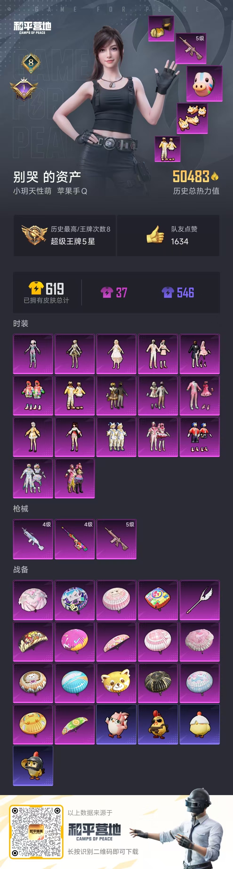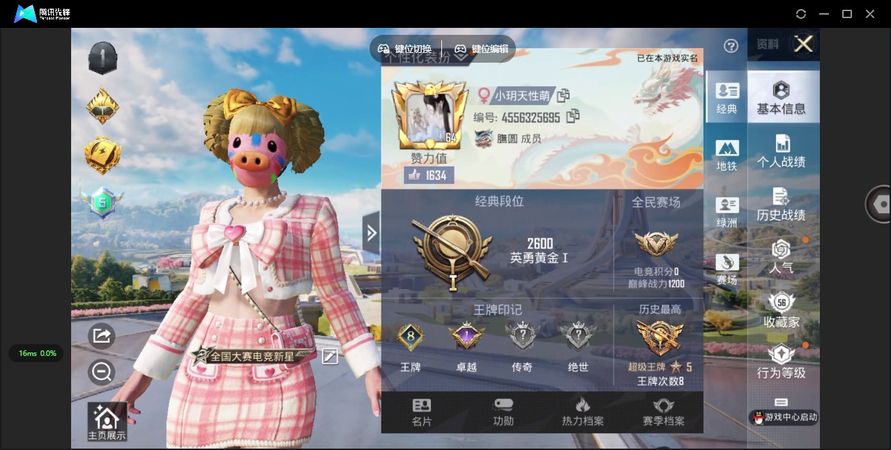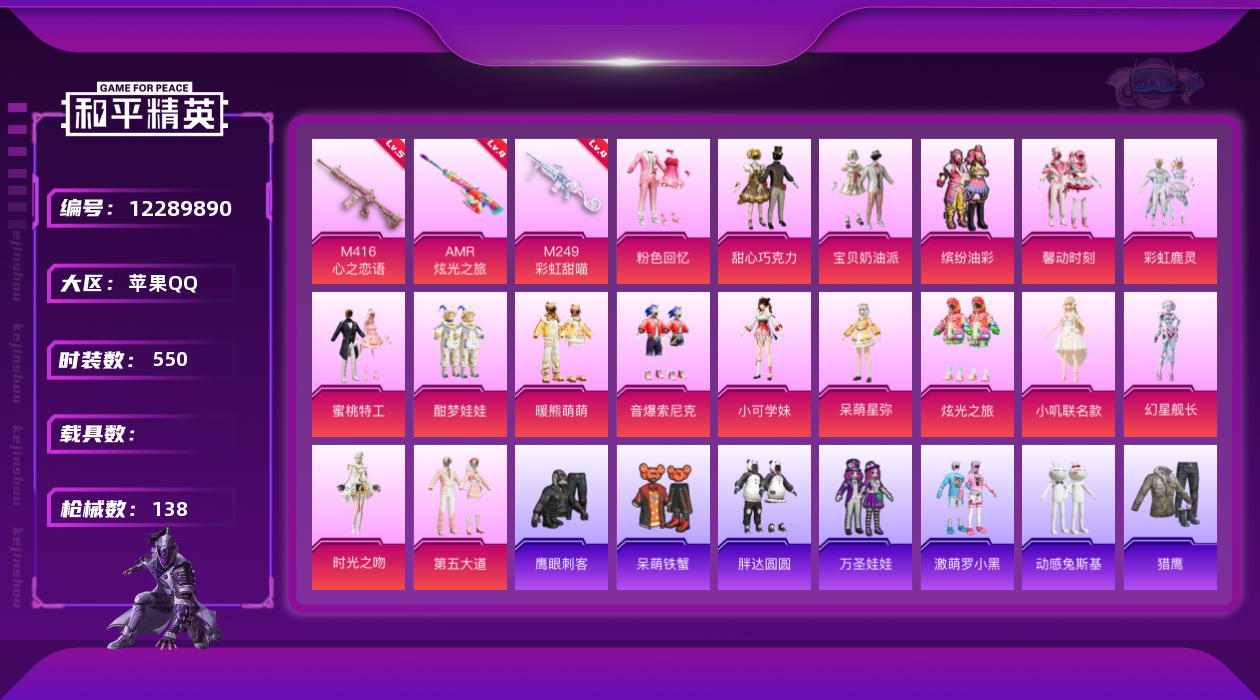 [12289890]17粉装 3特效枪 8印记 可二次 可修改实名 优质装备:甜心巧克力,M416心之恋语,宝贝奶油派,缤纷油彩(猪妹猪脸妹),粉色回忆,馨动时刻,M249彩虹甜喵(M249-彩虹甜喵),AMR炫光之旅,幻星舰长,时光之吻 热门装扮:蜜桃特工,彩虹鹿灵,酣梦娃娃,暖熊萌萌,音爆索尼克,第五大道,呆萌星弥,小可学妹,炫光之旅,小叽联名款,动感兔斯基,胖达圆圆,激萌罗小黑,鹰眼刺客,万圣娃娃,呆萌铁蟹 五级特效枪:五级M416-心之恋语 四级特效枪:四级AMR-炫光之旅,四级M249-彩虹甜喵 紫色装扮:云朵鹅,雪绒豹,SS33特训套装,青涩时光,顶瓜瓜,SS23特训,田园牧歌,熠彩粉晶,碧波幻想,轻风白浪,幻彩翩翩,和煦暖阳,SS22特训,莱茵河畔,香榭午后,龙舌兰冰茶,妙红点点,夏日音浪,夏日倾情,完美偶像,帅气教官,幻世战舞者,幻影武者,战地督导,冷焰舞者,人气偶像,军械专家,娇憨猪猪,冰爽风暴,浓情摩卡,魔力冰咖,SS21特训,SS20特训,暖心橘喵,夏雨游龙,萌趣咩咩,浓情蜜辣,软羊咩咩,SS19特训,粉团憨憨,龙的传人,飞行日记,魅力单车,鹤鸣,麻辣教官,黄色伏地魔,黄色名流,黄色运动,黑色伏地魔,龙腾端午,龟仙人,都市魅力,酒红色名流,野性战心,长空猛禽,霓虹街区,青年教官,探宝勇士,炫蓝之夏,湖蓝色名流,滨海假日,滨海厨神,潮流炫酷,灰色格斗者,灼焰舞者,牛气冲天,牛气满满,深蓝色名流,格斗先锋,极速红龙,涂山之恋,橘黑制服,绮丽涂鸦,缤纷果语,红色运动,荣耀,荧惑魅影,蓝彩潮人,蓝色运动,虎虎生威吉莉,街头潮人,白色伏地魔,猎鹰,猛禽,甜蜜告白,甜蜜熊情侣,白熊同盟,破晓战魂,破蛋小黄鸡,空岛之星,空投萌叽,竞技达人朋克,玉兔迎春,竞技名士,惊鸿侠骨,粉红小猪,甜梦熊熊,神气柴柴,懵萌河马,SS24特训(SS24特训套装),萤火魅影(套装-荧惑魅影),SS25特训,皇家花园,绝对偶像,锦衣飞扬,星际旅行,Alan Walker,湖雨初晴,舰行太空,明鸳圣池,浪漫天命,小丑鱼,SS26特训,白糯汤圆,精神漫游,摇滚狂鲨,淡雅花蕊,青龙圣者,纯白誓言,机械征服者,耀粉歌者,绯格组合,青玉碎影,萌黄之夏,光之冒险,漫步者,冰冻风暴 优质战备:小叽联名款降落伞,幻彩电音降落伞,冷漠罗丽降落伞,冰川粉黛飞行器,彩虹甜喵降落伞,暖熊萌萌降落伞,垂柳戏鸭降落伞,炫光之