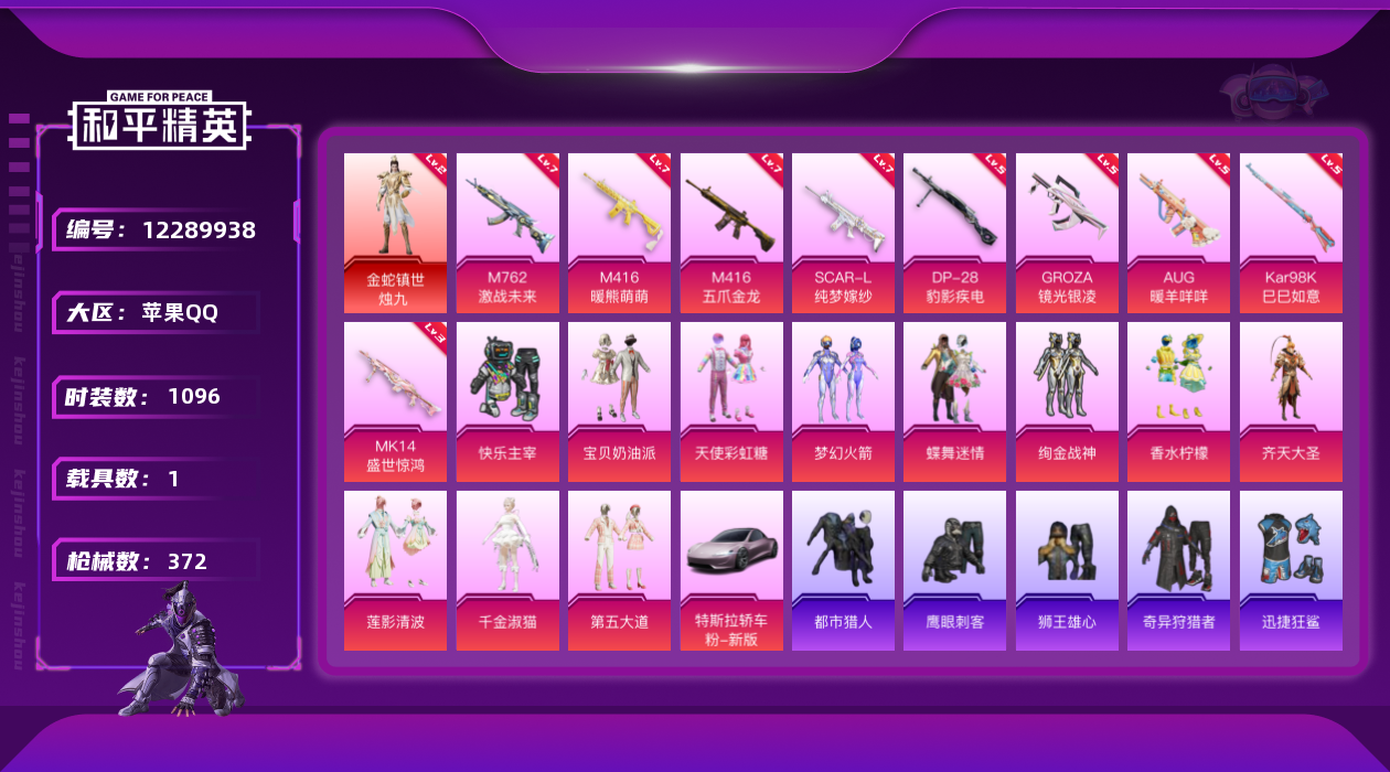 [12289938]1红装 11粉装 9特效枪 1载具 30印记 可二次 可修改实名 身法装备:都市猎人,暗影哥特(红眼罩),萌熊伴侣背包(粉熊背包) 优质装备:金蛇镇世-烛九,二级金蛇镇世-烛九(2级烛九),特斯拉Roadster(沁心粉),都市猎人,萌熊伴侣背包(粉熊背包),M416五爪金龙,奇异狩猎者,梦幻火箭(新101)(新火箭少女101粉色套装),蝶舞迷情,快乐主宰,宝贝奶油派,天使彩虹糖,香水柠檬,M762激战未来,绚金战神,M416暖熊萌萌,SCAR-L纯梦嫁纱,七级SCAR-L-纯梦嫁纱,七级M416-暖熊萌萌,七级M762-激战未来,七级M416-五爪金龙,千金淑猫,GROZA-镜光银凌,MK14-盛世惊鸿,AUG-暖羊咩咩,Kar98K-巳巳如意 热门装扮:齐天大圣,第五大道,莲影清波,软萌银虎,蔷薇魔法师,胖达团团,潮萌小黄鸭,仓鼠灰灰,狮王雄心,迅捷狂鲨,鹰眼刺客,万圣娃娃,梦魇先生,爱崽白熊,浪漫波比,都市猎人,暗夜武装,绯红秘境 稀有枪皮:DP-28-豹影疾电 五级特效枪:五级GROZA-镜光银凌,五级Kar98K-巳巳如意,五级DP-28-豹影疾电,五级AUG-暖羊咩咩 三级特效枪:三级MK14-盛世惊鸿 紫色装扮:SS30特训套装,SS31特训套装,浪漫假日,SS33特训套装,青涩时光,SS23特训,田园牧歌,轻风白浪,幻彩翩翩,和煦暖阳,SS22特训,香榭午后,飞狐塔尔斯,妙红点点,灵蜜圈圈,夏日音浪,北国孤狼,千禧之恋,午夜朋克,吉莉礼服,和平特警,圣诞大吉,坚韧舞者,夜莺强袭者,完美偶像,帅气教官,幻世战舞者,幻影武者,怒火燎原,凛冬战士,SS4特训,SS2特训,SS3特训,SS5特训,六六大吉,军械专家,冰川特警,娇憨猪猪,时空追击者,暴风机械师,SS16特训,天籁歌者,瑞龙福将,团圆交子,SS17特训,迅捷之星,科技之星,SS14特训,萌趣颜团子,特种颜团子,星梦畅游,青春冒险家,光影梦想家,潮流游乐家,SS15特训,暗夜傀儡,SS21特训,甜心亚梦,虚音幻奏,SS20特训,战地菁英,萌趣咩咩,异彩先驱,缤纷焰火,SS18特训,豚鼠丹丹,软羊咩咩,飞驰魅影,音速流光,SS19特训,圣诞惊喜,龙的传人,飞行日记,魅力单车,鹤鸣,麻辣教官,黄色伏地魔,黎明保卫者,龙腾端午,风暴特警,龟仙人,冰河战士,龙魂突击队,蝶变,香桃花海,金鼠迎春,酷潮