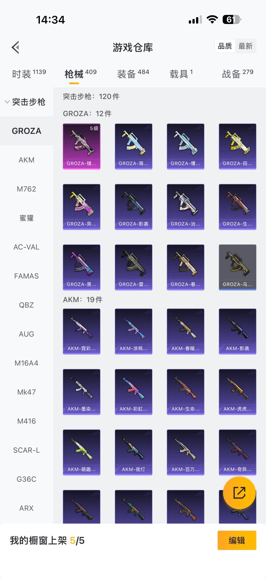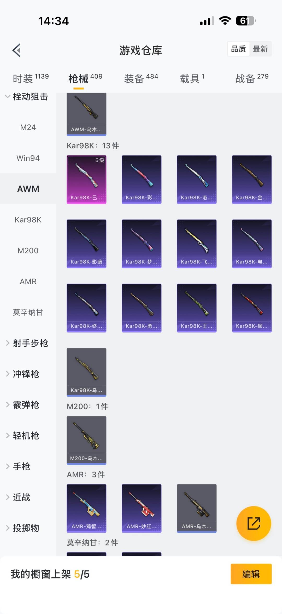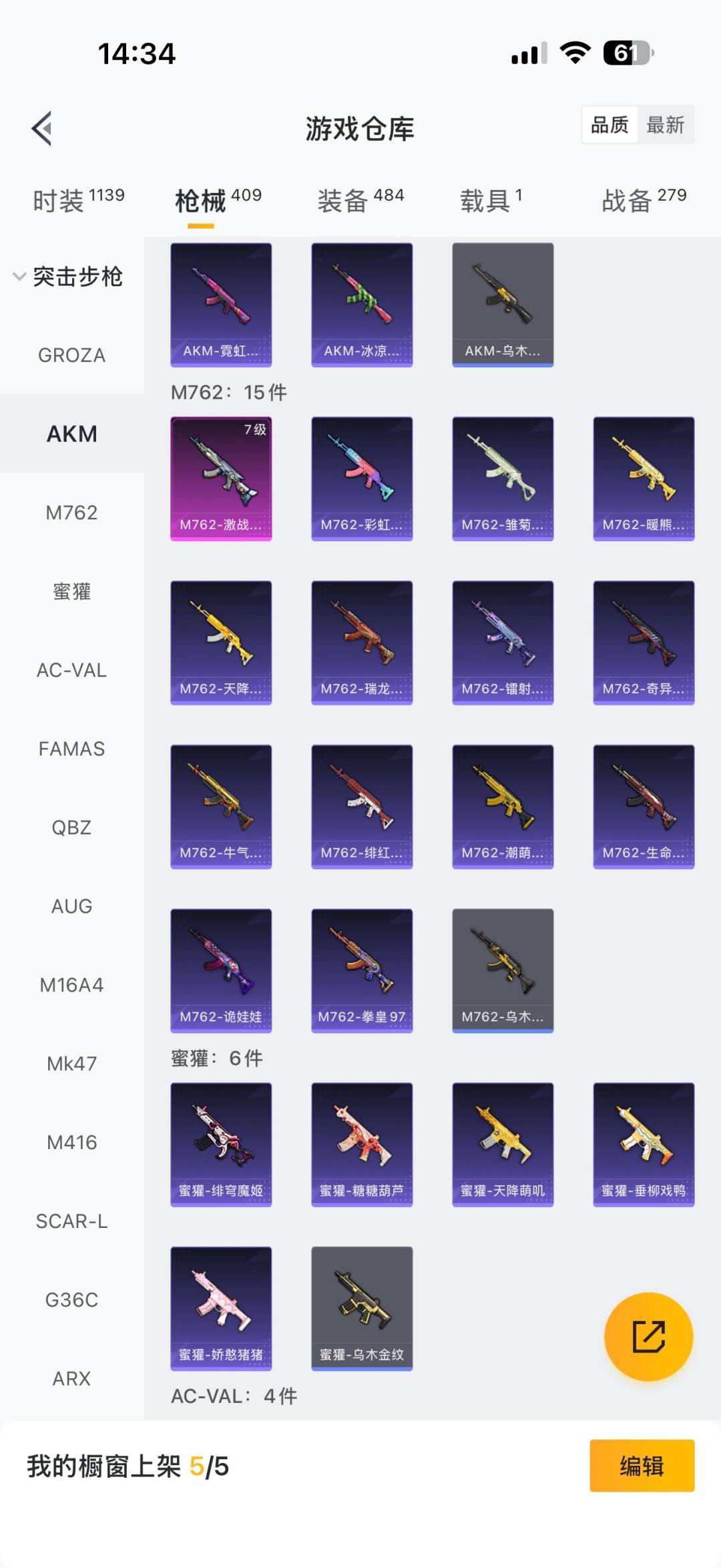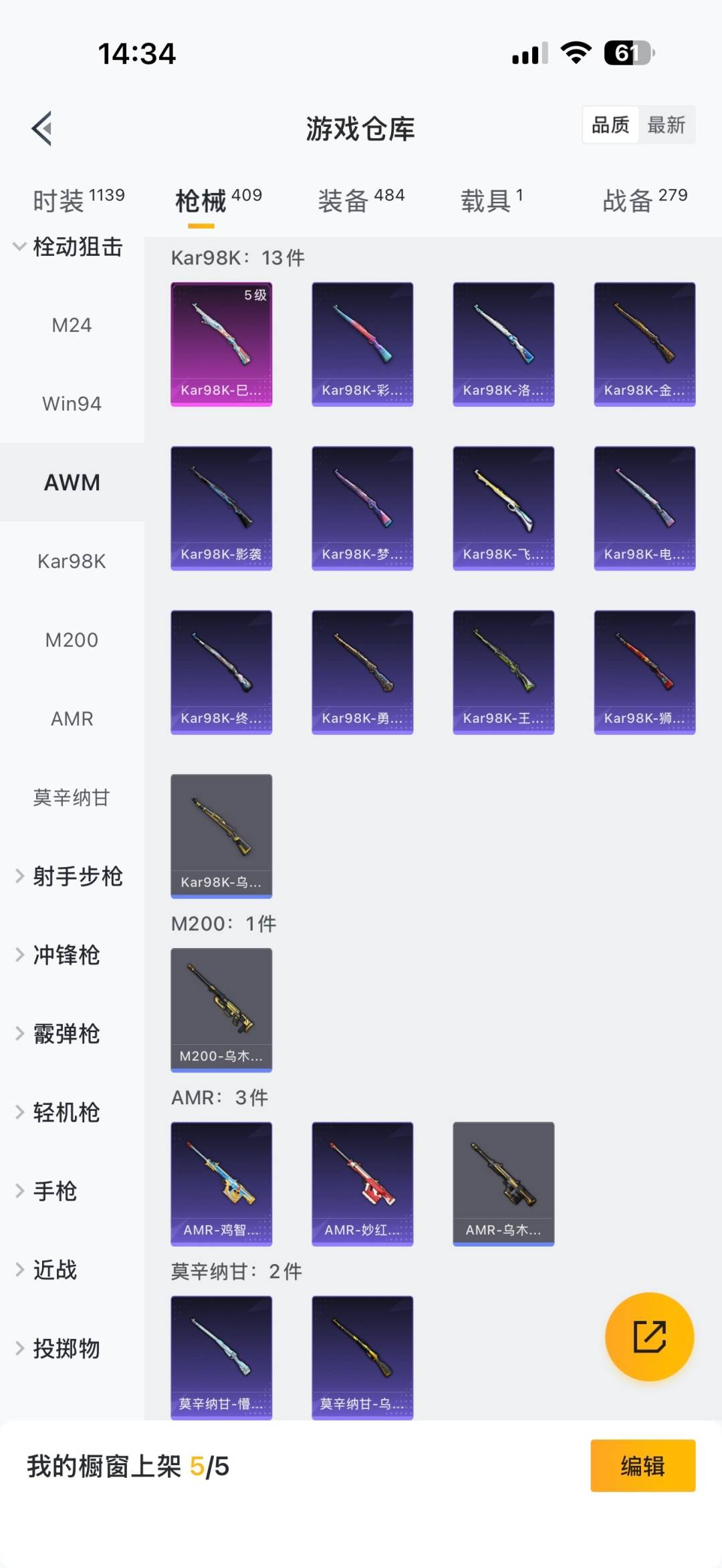 GROZA-镜光银凌,M762-激战未来,AUG-暖羊咩咩,M416-暖熊萌萌,M416-五爪金龙,SCAR-L-纯梦嫁纱,Kar98K-巳巳如意,Mk14-盛世惊鸿