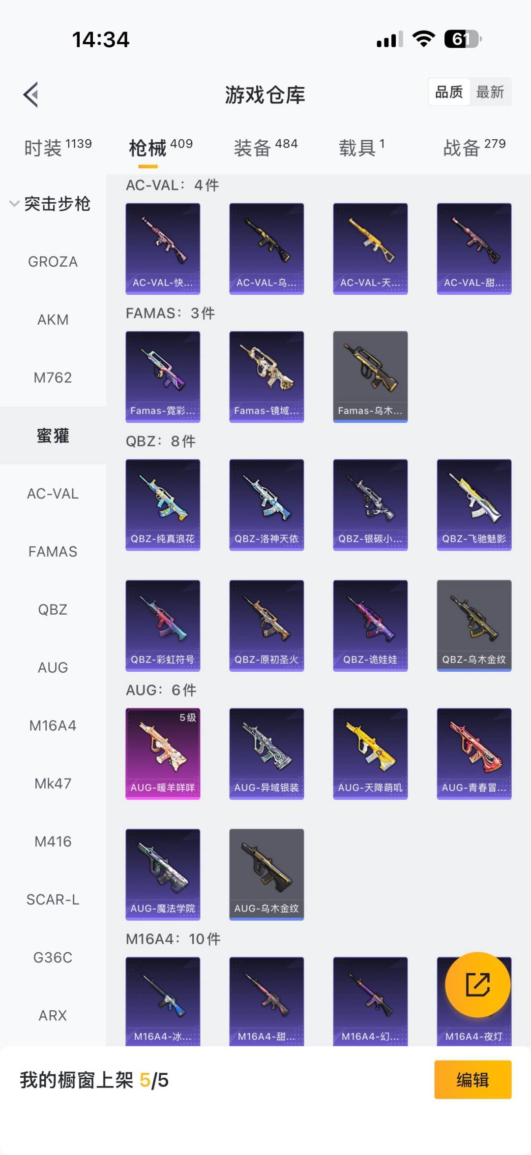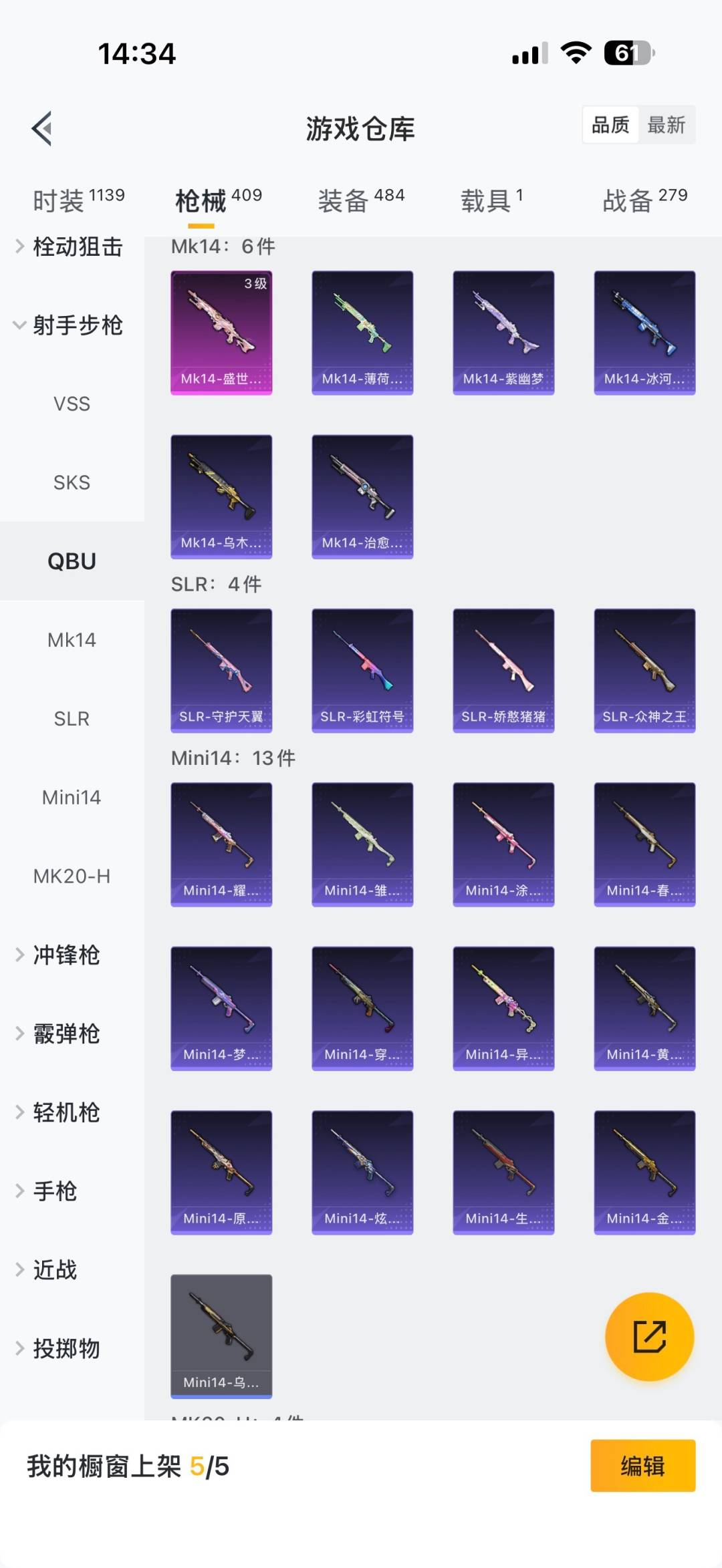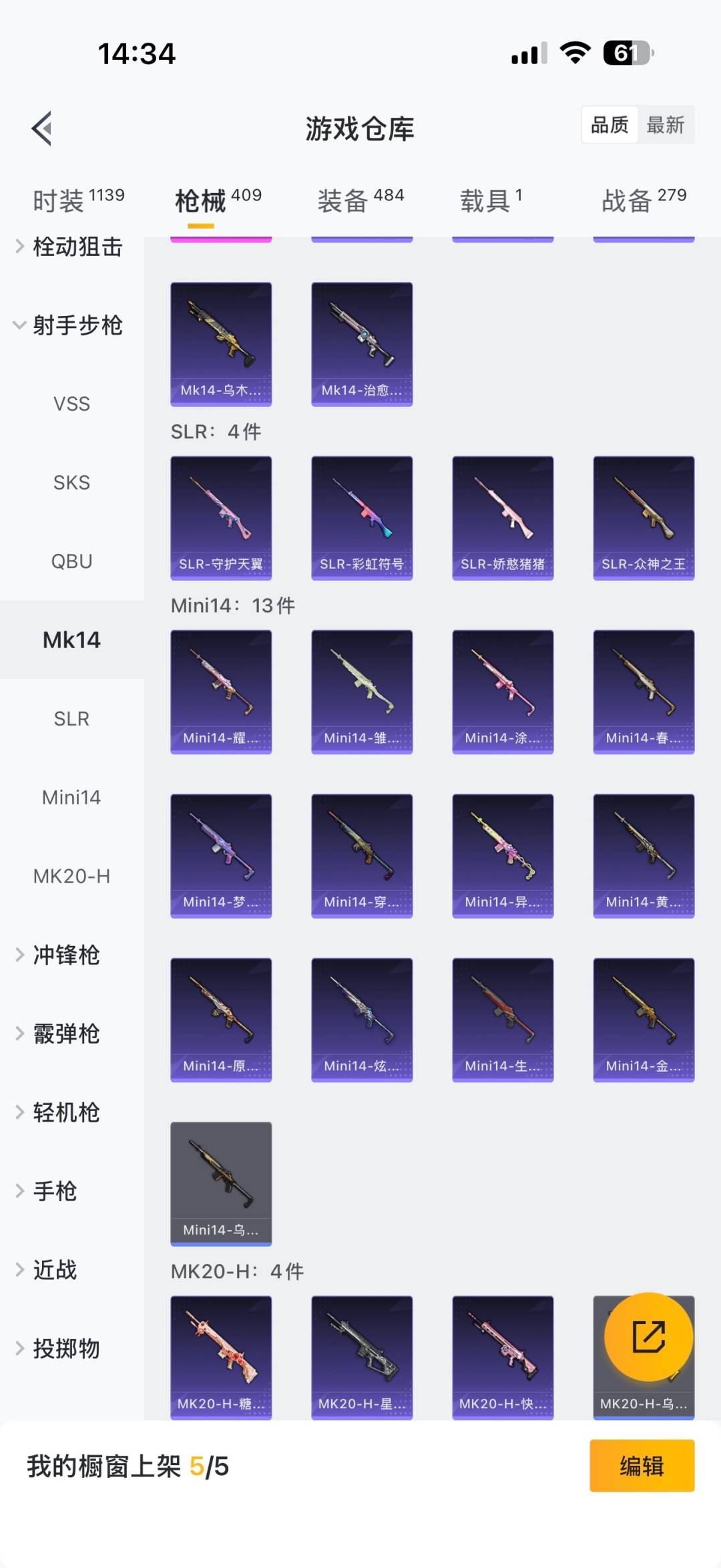 GROZA-镜光银凌,M762-激战未来,AUG-暖羊咩咩,M416-暖熊萌萌,M416-五爪金龙,SCAR-L-纯梦嫁纱,Kar98K-巳巳如意,Mk14-盛世惊鸿
