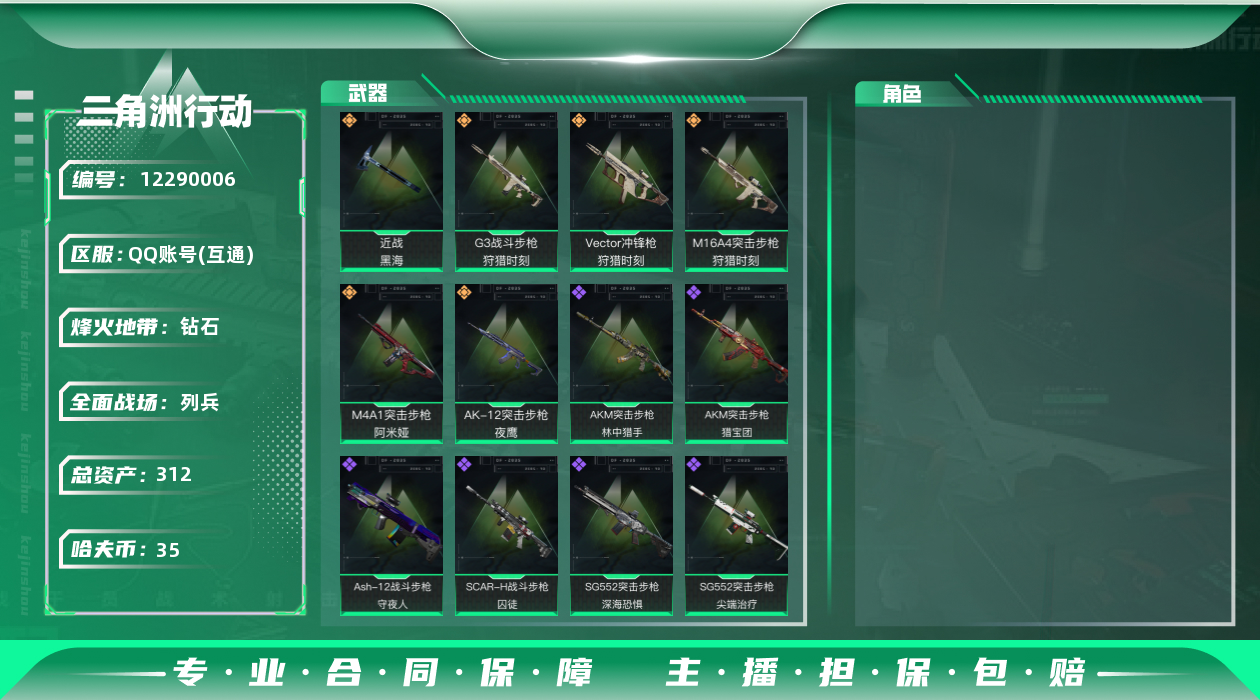 [12290006]总资产:312.1M 1近战传说 6传说枪械 哈夫币:35.749K 顶级安全箱(3×3)9.15号到期 可二次 可修改实名 优质装备:近战-黑海,顶级安全箱(3x3) 烽火地带段位:钻石 全面战场段位:列兵 传说武器皮肤:AK-12突击步枪-夜鹰,M16A4突击步枪-狩猎时刻,M4A1突击步枪-阿米娅,Vector冲锋枪-狩猎时刻,G3战斗步枪-狩猎时刻 史诗武器皮肤:Ash-12战斗步枪-守夜人,SG552突击步枪-尖端治疗,SG552突击步枪-深海恐惧,AKM突击步枪-林中猎手,SCAR-H战斗步枪-囚徒,AKM突击步枪-猎宝团