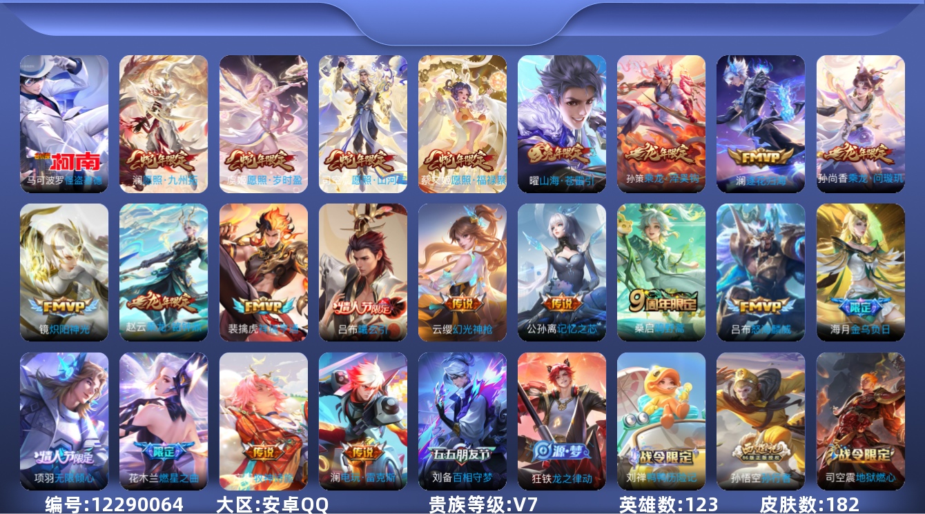 [12290064]V7 1珍品传说 21传说 123英雄 182皮肤 可修改实名 优质装备:怪盗基德,炽阳神光,山海·苍雷引(电光曜子),燃星之曲,记忆之芯(机甲兔),电玩·雷克斯,澜逐花归海,金乌负日,牧神诗旅 传说皮:乘龙·问璇玑(孙尚香年限),乘龙·铭钟鼎(赵云年限),乘龙·淬吴钩(孙策年限),吕布曦玄引,祥瑞亨通,幻光神枪 珍宝阁皮:妄想食味 限定皮:愿照·九州拓(澜年限),愿照·福禄聚(蔡文姬年限),愿照·岁时盈(虞姬年限),愿照·山河定(司空震年限),鸣野蒿,无限倾心-项羽,怒海麟威,奔雷神使(牛魔年限),孙行者,山海·玄木吟(马可年限) 史诗皮:鸭鸭历险记-刘禅,器灵·浮梦炉,化蝶舞,星界战将,龙之律动,怒海争锋,琥珀纪元伽罗,紫霞仙子,永昼,江河有灵,蒙恬荣光圣徽,匿光破解者,偶像歌手,白蛇,百相守梦(刘备),猫狗日记-孙策,节奏热浪,水果甜心,星夜王子,德古拉伯爵,幽灵船长,鬼剑武藏,地狱岩魂,乘风破浪,逐浪之夏,曙光守护者,箭羽风息,金属风暴,圣诞恋歌,鹰眼统帅,魅力维加斯,未来纪元-赵云,玫瑰异探