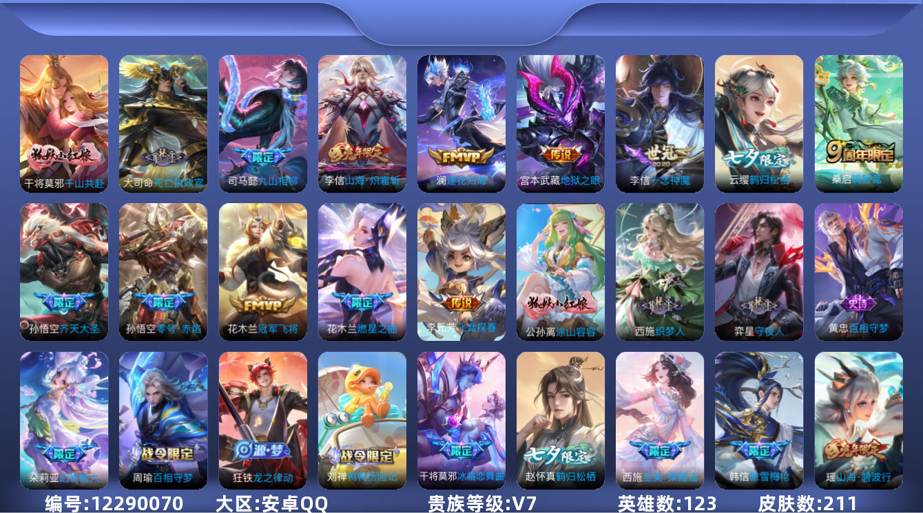 - [12082621]V7 5传说 123英雄 205皮肤 可修改实名 女号 优质装备:久胜战神,炽阳神光,地狱火,无双飞将 珍宝阁皮:蔷薇恋人,女武神 限定皮:至尊宝,补天,高山流水,五谷丰年,梁祝,天狼绘梦者,李小龙,大圣娶亲,玉兔公主 史诗皮:百相守梦-黄忠,紫霞仙子,白龙吟,千年之狐,永昼,江河有灵,浮梦罗烟,魅语,蒙恬荣光圣徽,冰冠公主,青蛇,偶像歌手,电玩·爆裂旋风,乱世虎臣,节奏热浪,女仆咖啡,水果甜心,星夜王子,心灵骇客,暗隐猎兽者,幽灵船长,鬼剑武藏,心灵战警,舞动绿茵,纤云弄巧,乘风破浪,逐浪之夏,水晶猎龙者,唤灵魅影,金属风暴,原初追逐者,圣诞恋歌,鹰眼统帅,魅力维加斯,黎明之约,无心,未来纪元-赵云