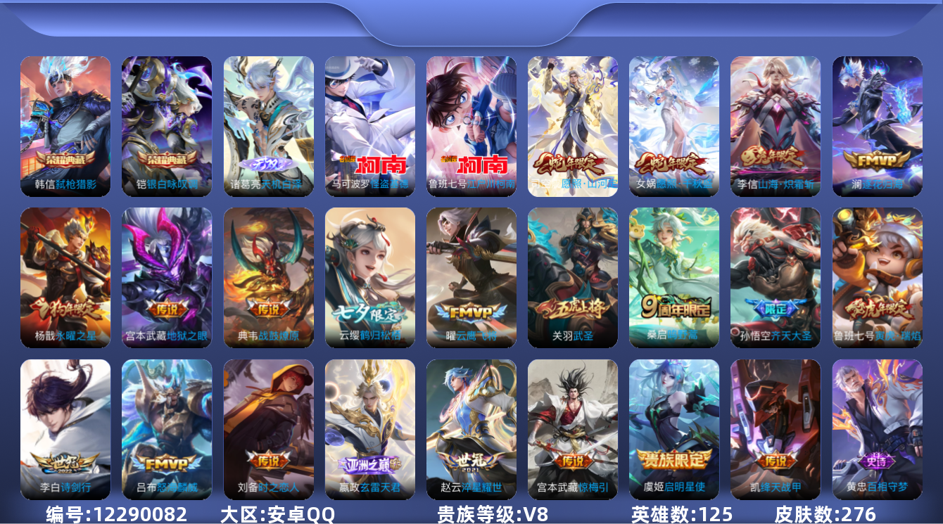 [12290082]V8 2典藏 1无双 2珍品传说 21传说 125英雄 276皮肤 可修改实名 优质装备:银白咏叹调(倪克斯侍卫),弑枪猎影(韩信典藏),天机白泽,江户川柯南,怪盗基德,云鹰飞将(小将军),绛天战甲(鸡嘴战神),地狱之眼,时之恋人-刘备(电焊工),淬星耀世,山海·炽霜斩(李信年限),鹤归松栖(云缨),惊梅引,澜逐花归海,玄雷天君 传说皮:典韦战鼓燎原 珍宝阁皮:妄想食味,玩趣恶龙 限定皮:愿照·山河定(司空震年限),愿照·千秋盛(女娲年限),逐霄战戟,鸣野蒿,傲雪梅枪,神威(电光马子),遇见飞天,高山流水,诗剑行,齐天大圣,匿光决锋者,怒海麟威,五谷丰年,青龙志(铠年限),武圣,御风骁将(吕布年限),逐梦之翼,岱宗(典韦年限),天狼征服者,永曜之星,猪悟能,引擎之心,青春决赛季,寅虎·御盾(廉颇年限),寅虎·瑞焰(虎皮蛋子),唐三藏 史诗皮:苍鳞隐世,化蝶舞,灵蛊蚀心,星界战将,谪仙醉月,龙之律动,藏狐·褐绒,石田雨龙,破空之剑,蒙犽顽岩魄,超元猎域,百相守梦-百里守约,百相守梦-黄忠,苍穹之光,电玩小子(小书包),黄金分割率,特工魅影,江河有灵,末日机甲-莱西奥,鹤归松栖(赵怀真),真我赫兹(镜),真我赫兹(百里守约),百解令(蒙犽),高渐离燃音魔法,蒙恬荣光圣徽,青蛇,偶像歌手,电玩·爆裂旋风,暗夜猫娘,龙骑士(小龙虾),末日机甲-吕布,猫狗日记-孙策,乱世虎臣,节奏热浪,修罗,女仆咖啡,摇滚巨星,水果甜心,绅士熊喵,天才门将,星夜王子,心灵骇客,功夫厨神,德古拉伯爵,暗隐猎兽者,幽灵船长,鬼剑武藏,心灵战警,天秀·启明,舞动绿茵,地狱岩魂,纤云弄巧,拒霜思,缤纷独角兽,乘风破浪,逐浪之夏,水晶猎龙者,曙光守护者,箭羽风息,唤灵魅影,金属风暴,原初追逐者,圣诞狂欢,圣诞恋歌,鹰眼统帅,魅力维加斯,黎明之约,赏金猎手,天秀·音浪,寅虎·御盾,未来纪元-赵云