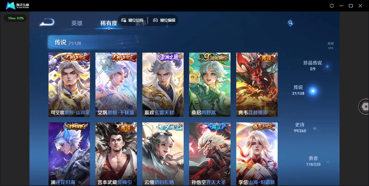 - [12049218]V8 1无双 2珍品传说 15传说 117英雄 140皮肤 可修改实名 连体和平 优质装备:器灵·螭龙剑,器灵·落星盏,一念神魔,无双飞将,浮生妄,妄想实况,霜月吟,澜逐花归海 珍品传说:时之奇旅-孙策 传说皮:祥瑞亨通,幻光神枪 限定皮:愿照·九州拓(澜年限),愿照·山河定(司空震年限),逐霄战戟,映山客,鸣野蒿,神威(电光马子),山海·碧波行(瑶年限),影龙天霄,降魔,祈雪灵祝(雪兔子),百木心枪,山海·玄木吟(马可年限) 史诗皮:器灵·浮梦炉,糖绘人间,龙之律动,茶境仙,上官婉儿群星魔术团,蔬乡物语(鲁班七号),百相守梦-百里守约,百相守梦-黄忠,永昼,电玩·爆裂旋风,百相守梦(刘备),暗夜猫娘,水果甜心,天才门将,星夜王子,暗隐猎兽者,幽灵船长,鬼剑武藏,暗渊魔法,天秀·启明,舞动绿茵,缤纷独角兽,逐浪之夏,圣诞狂欢,圣诞恋歌,魅力维加斯,雪上飞焰,赏金猎手,玫瑰异探