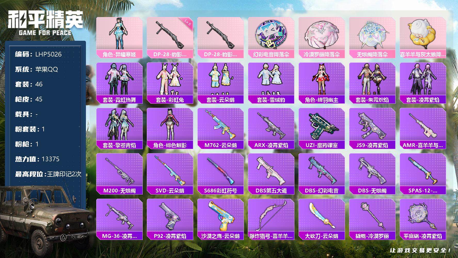 [12290218]【价急出/详情看图:苹果 手Q-1粉装-1特效枪-0载具-0粉色飞行器-13375热力值-2王牌印记-46套装-45枪皮【粉色套装】:角色-异瞳寒姬【粉色枪皮等级】:DP-28-豹影疾电(五级)【粉色枪皮】:DP-28-豹影疾电