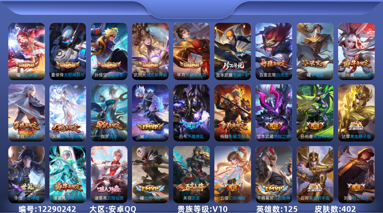 [12290242]V10 5典藏 1珍品传说 31传说 125英雄 402皮肤 典藏英雄武则天 女号 可修改实名 优质装备:倪克斯神谕(宇宙婆娘),无限飓风号(高达),大秦宣太后,全息碎影(猴子典藏),拾光映像(瑶典藏),黑崎一护,黄金狮子座,黄金射手座,冠军飞将,云鹰飞将(小将军),黄金白羊座,猫影幻舞,久胜战神,一念神魔,末日机甲-孙尚香(绿蚂蚱),地狱火,零号·赤焰,海洋之心,地狱之眼,胖达荣荣,李逍遥,时之恋人-刘备(电焊工),超时空战士-狄仁杰,澜逐花归海,艾琳觅芳踪 传说皮:幻光神枪 珍宝阁皮:胡桃夹子,优雅恋人,玩趣恶龙 限定皮:愿照·千秋盛(女娲年限),至尊宝,白虎志(电光耗子),凤求凰(白切鸡),凤凰于飞,太华(伽罗年限),武陵仙君(小桃花),时之彼端,白鹤梁神女,魔法小厨娘,时雨天司(水龙头),神威(电光马子),飞衡(韩信年限),玄嵩(庄周年限),遇见飞天,高山流水,五谷丰年,青龙志(铠年限),冰锋战神,幽恒(沐浴露),武圣,游园惊梦,梁祝,御风骁将(吕布年限),天狼狩猎者,龙胆,逐梦之星,烈魂,岱宗(典韦年限),天狼溯光者,虎魄,天狼征服者,奔雷神使(牛魔年限),祈雪灵祝(雪兔子),天狼绘梦者,李小龙,玄武志(苏烈年限),永曜之星,辉光之辰,如梦令-嫦娥,如梦令-后羿,霸王别姬-虞姬,大圣娶亲,天魔缭乱,乒乒小将,神奇女侠 史诗皮:鸭鸭历险记-刘禅,瑰影绮梦,化蝶舞,灵蛊蚀心,龙之律动,石田雨龙,幻珠鲛人,奇遇星旅,蔬乡物语(鲁班七号),百相守梦-黄忠,遇见神鹿,紫霞仙子,苍穹之光,电玩小子(小书包),白龙吟,黄金分割率,特工魅影,千年之狐,电玩·爆裂旋风,高渐离燃音魔法,偶像歌手,龙骑士(小龙虾),白蛇,暗夜猫娘,魅语,无限星赏官,晚萤,冰冠公主,青蛇,末日机甲-吕布,猫狗日记-孙策,猫狗日记-大乔,时之恋人-孙尚香,乱世虎臣,节奏热浪,修罗,女仆咖啡,摇滚巨星,水果甜心,绅士熊喵,天才门将,星夜王子,心灵骇客,功夫厨神,德古拉伯爵,暗隐猎兽者,幽灵船长,鬼剑武藏,暗渊魔法,心灵战警,乐园奇幻夜,舞动绿茵,地狱岩魂,诗语江南,纤云弄巧,繁星吟游(呼啦呼啦),缤纷独角兽,乘风破浪,逐浪之夏,水晶猎龙者,曙光守护者,热力回旋,箭羽风息,金属风暴,原初追逐者,圣诞狂欢,圣诞恋歌,鹰眼统帅,暗夜贵公子,魅力维加斯,