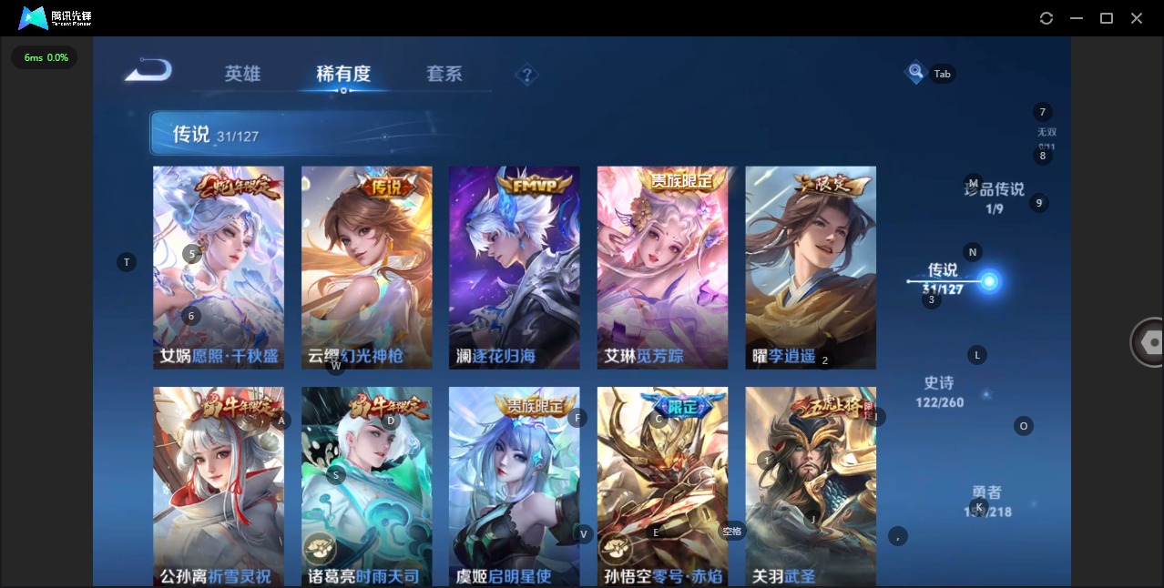 - [11414677]V6 7传说 112英雄 92皮肤 可修改实名 女号 优质装备:零号·赤焰 传说皮:云诺千山,幻光神枪 珍宝阁皮:妄想食味 限定皮:愿照·九州拓(澜年限),愿照·岁时盈(虞姬年限),逐霄战戟,鸣野蒿,傲雪梅枪,遇见飞天,诗剑行 史诗皮:龙之律动,茶境仙,百相守梦-百里守约,百相守梦-黄忠,紫霞仙子,特工魅影,江河有灵,冰冠公主,暗夜猫娘,乱世虎臣,节奏热浪,水果甜心,心灵骇客,暗隐猎兽者,鬼剑武藏,水晶猎龙者,魅力维加斯,未来纪元-赵云