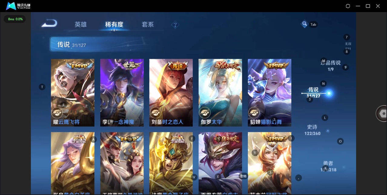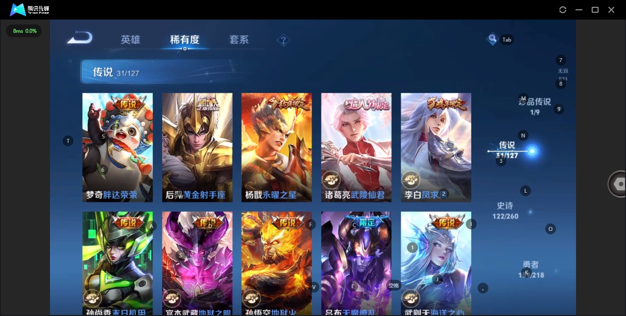 - [11657222]V8 1典藏 4无双 7珍品传说 40传说 105英雄 174皮肤 可修改实名 优质装备:银白咏叹调(倪克斯侍卫),韩信群星魔术团(韩信无双),花合斗,离恨烟(公孙离无双),器灵·螭龙剑,江户川柯南,怪盗基德,器灵·落星盏,酷洛米之心,大耳狗之梦,云鹰飞将(小将军),绛天战甲(鸡嘴战神),黄金白羊座,久胜战神,一念神魔,云霓雀翎,零号·赤焰,海洋之心,音你心动-周瑜,挚爱之约,无双飞将,山海·炽霜斩(李信年限),燃星之曲,浮生妄,妄想实况,妄想奇谈,澜逐花归海,黄金天蝎座,玄雷天君,涂山容容 珍品传说:时之奇旅-孙策,兔狲·蓬尾 传说皮:吕布曦玄引,云诺千山,铠冥王哈迪斯,续相思,星之鸣奏,祥瑞亨通,幻光神枪 珍宝阁皮:万物之道 限定皮:愿照·九州拓(澜年限),愿照·福禄聚(蔡文姬年限),愿照·岁时盈(虞姬年限),愿照·山河定(司空震年限),愿照·众生和(妲己年限),愿照·千秋盛(女娲年限),逐霄战戟,映山客,陌上桑,鸣野蒿,夏侯惇霜北刀,时雨天司(水龙头),诗剑行,怒海麟威,御风骁将(吕布年限),引擎之心,启示之音,冰霜神祇 史诗皮:鸭鸭历险记-刘禅,苍鳞隐世,器灵·浮梦炉,糖绘人间,狼魂孤将,绮世丹青,瑰影绮梦,化蝶舞,谪仙醉月,龙之律动,藏狐·褐绒,布丁狗之誓,茶境仙,怒海争锋,炽弈燎原,破空之剑,战舞者,东方月初,蒙犽顽岩魄,埋骨钱,海诺心动手记,百相守梦-百里守约,星界特工,百相守梦-黄忠,特工魅影,冰冠公主,青蛇,偶像歌手,暗夜猫娘,女仆咖啡,水果甜心,星夜王子,功夫厨神,鬼剑武藏,天秀·启明,地狱岩魂,缤纷独角兽,乘风破浪,逐浪之夏,月团寄思,水晶猎龙者,曙光守护者,金属风暴,圣诞恋歌,鹰眼统帅,魅力维加斯,赏金猎手,未来纪元-赵云