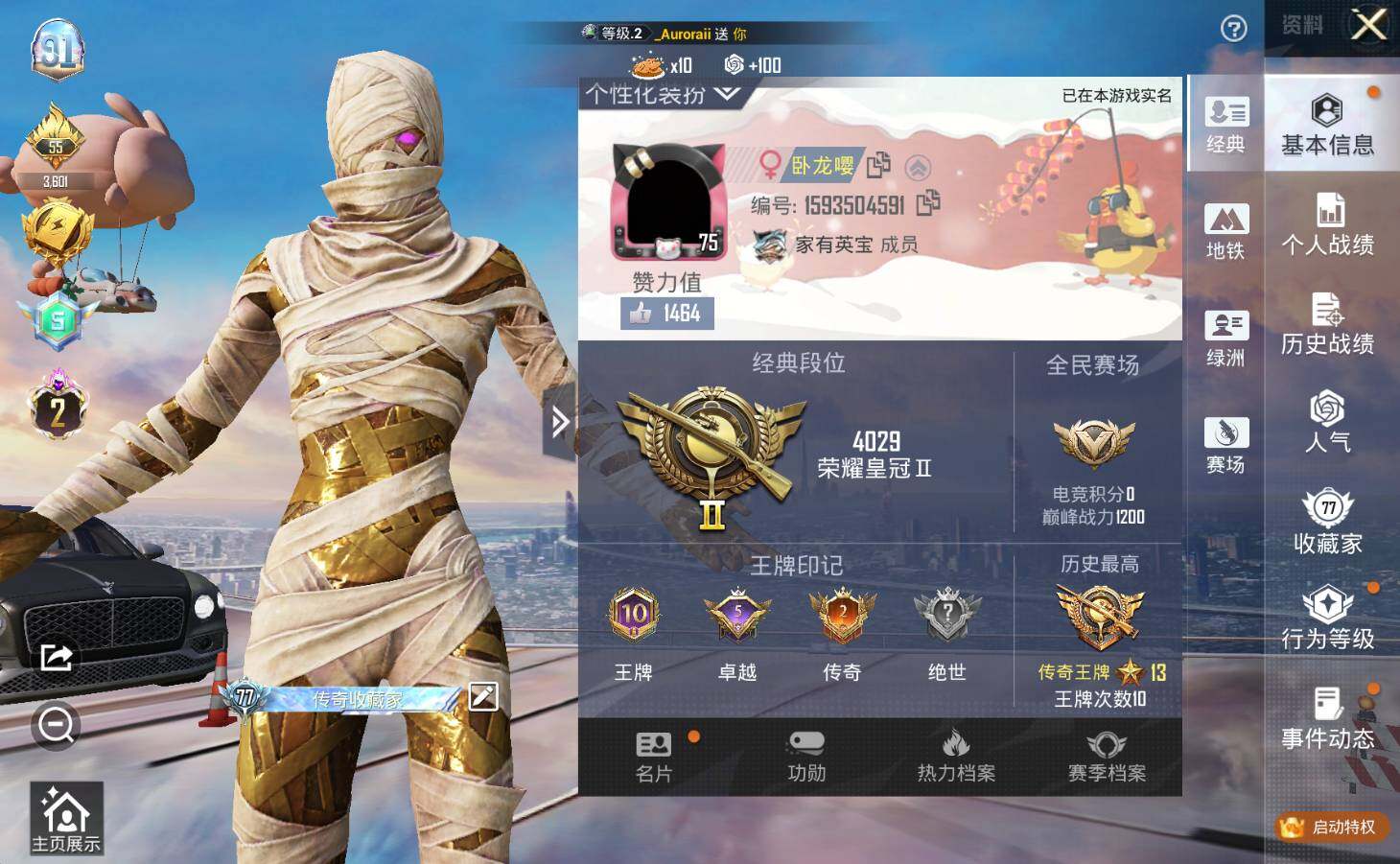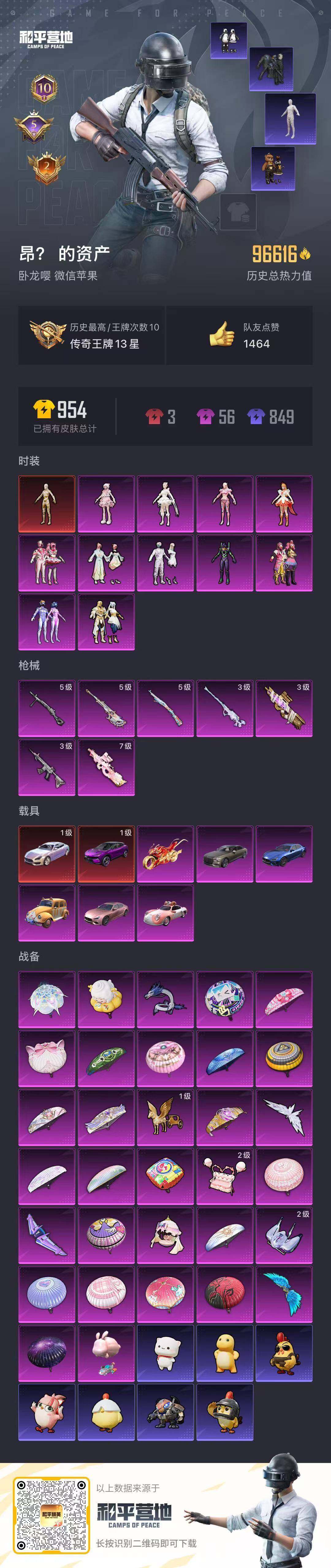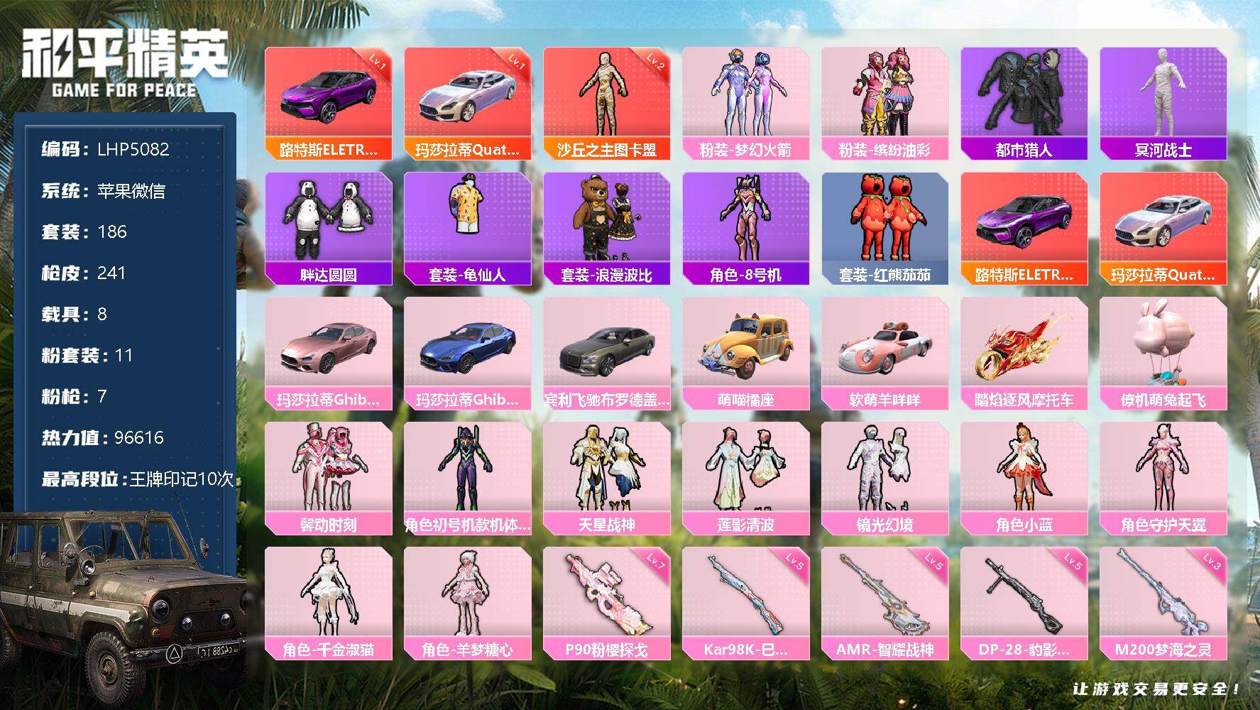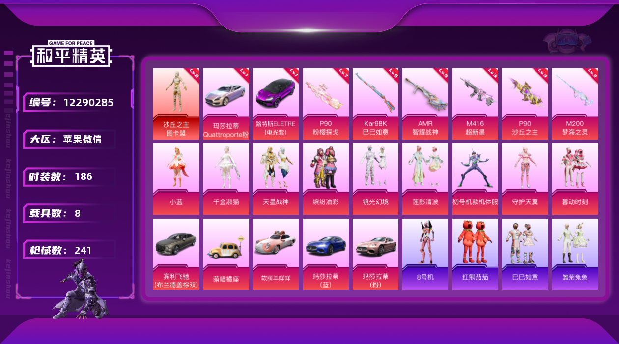 [12290285]老101/地铁满天赋【价急出/详情看图】】:苹果 微信-1神装-11粉装-7特效枪-8载具-8粉色飞行器-96616热力值-10王牌印记-186套装-241枪皮【红色载具】:路特斯ELETRE(电光紫)(一级),玛莎拉蒂Quattroporte(幻星粉)(一级)【红色神装等级】:沙丘之主-图卡盟(二级)【红色角色神装】:沙丘之主-图卡盟【热门品类】:粉装-梦幻火箭,粉装-缤纷油彩,套装-都市猎人,套装-冥河战士,套装-胖达圆圆,套装-龟仙人,套装-浪漫波比,角色-8号机,套装-红熊茄【粉色载具】:路特斯ELETRE(电光紫),玛莎拉蒂Quattroporte(幻星粉),玛莎拉蒂Ghibli(粉),玛莎拉蒂Ghibli(蓝),宾利飞驰(布罗德盖棕双色),萌喵橘座,软萌羊咩咩,踏焰逐风摩托车,僚机-萌兔起飞【粉色套装】:粉装-梦幻火箭,粉装-缤纷油彩,粉装-馨动时刻,角色-初号机款机体服,粉装-天星战神,粉装-莲影清波,粉装-镜光幻境,角色-小蓝,角色-守护天翼,角色-千金淑猫,角色-羊梦糖心【粉色枪皮等级】:M416-超新星(三级),P90-粉樱探戈(七级),P90-沙丘之主(三级),Kar98K-巳巳如意(五级),AMR-智耀战神(五级),M200-梦海之灵(三级),DP-28-豹影疾电(五级)【粉色枪皮】:M416-超新星,P90-粉樱探戈,P90-沙丘之主,Kar98K-巳巳如意,AMR-智耀战神,M200-梦海之灵,DP-28-豹影疾电【粉色飞行器】:梦幻火箭飞行器,梦幻舞会飞行器,璀璨巨星飞行器,粉樱探戈飞行器,镜光幻境飞行翼,沙丘之主天马,灵珠游龙飞行器