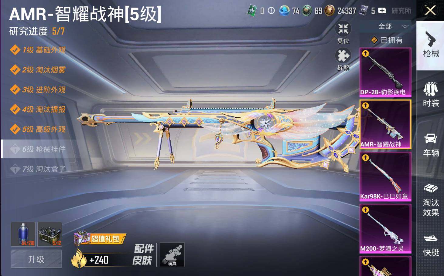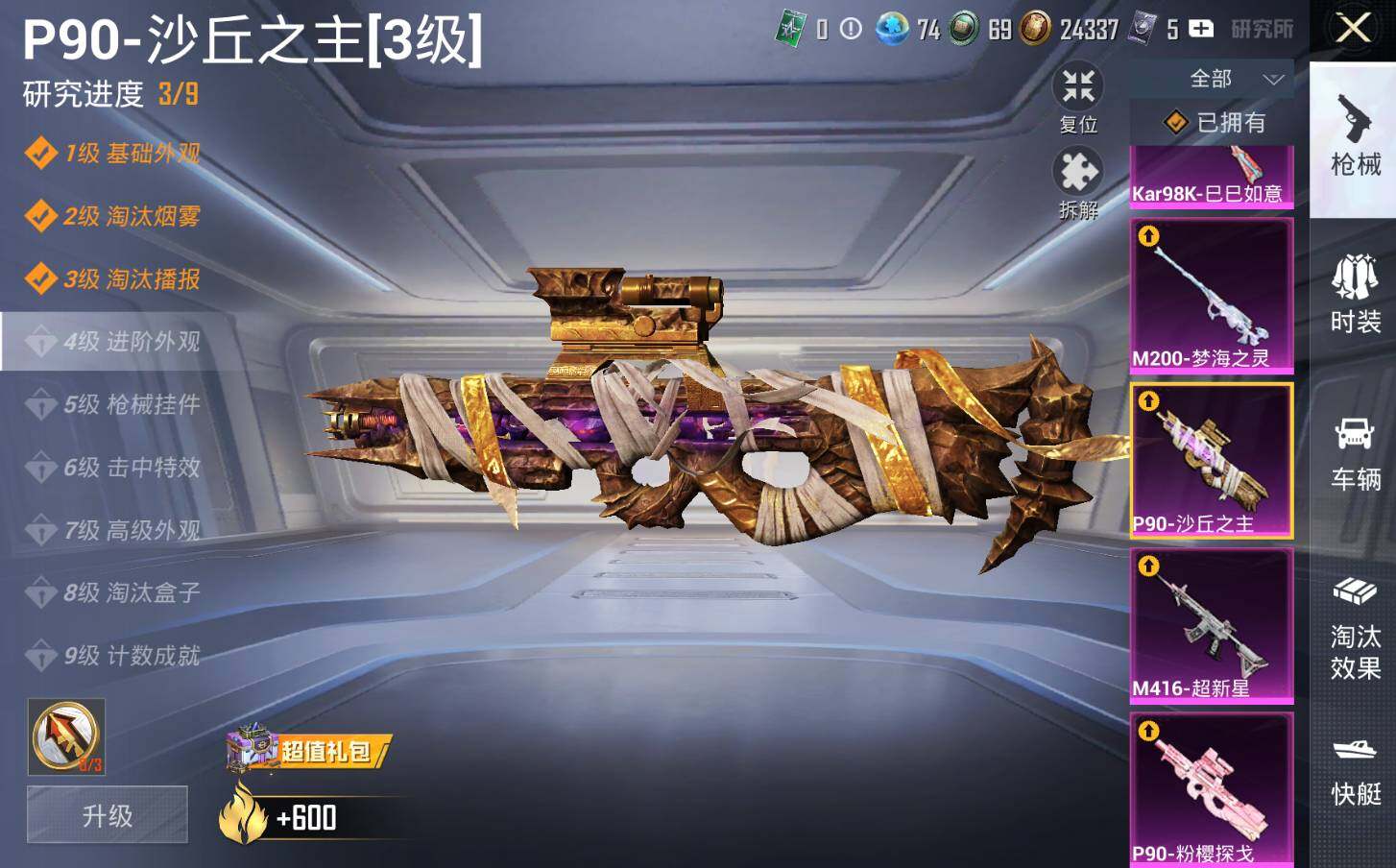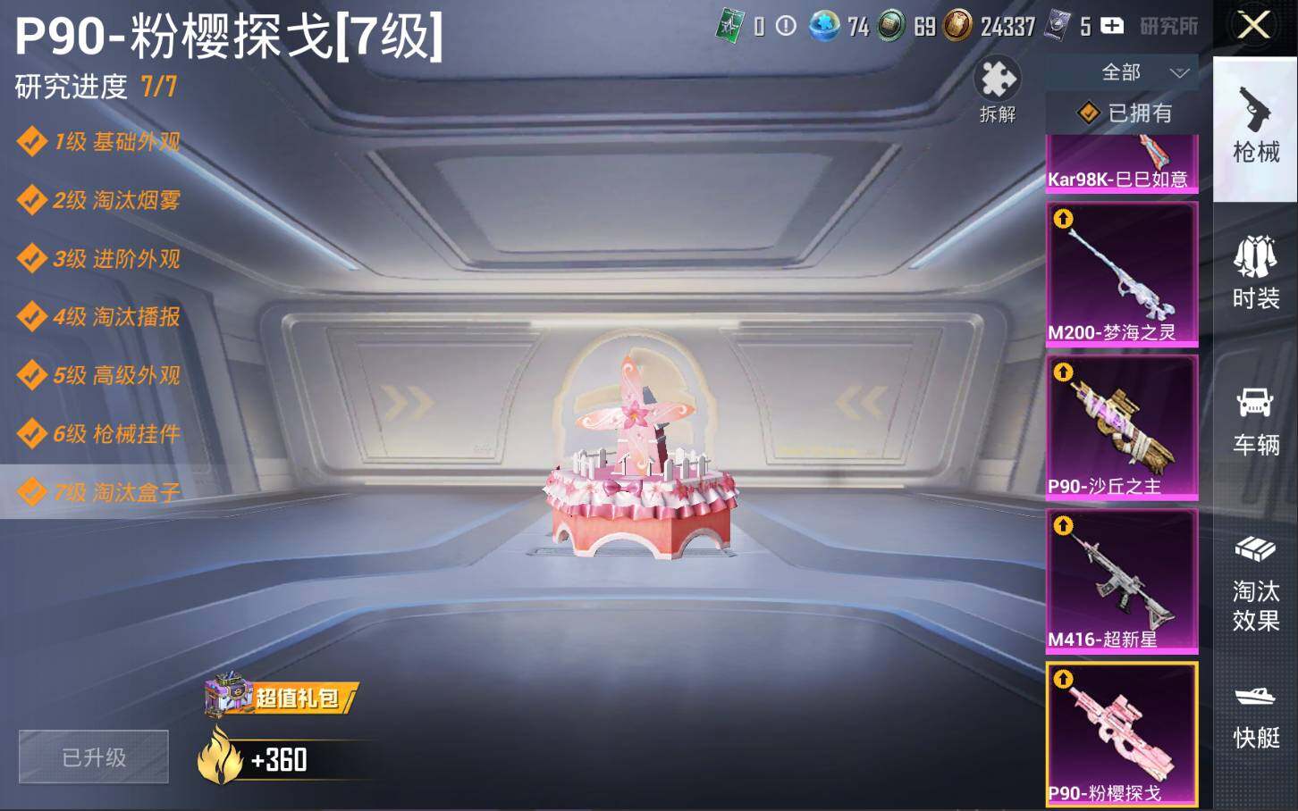 M416-超新星,P90-粉樱探戈,P90-沙丘之主,Kar98K-巳巳如意,M200-梦海之灵
