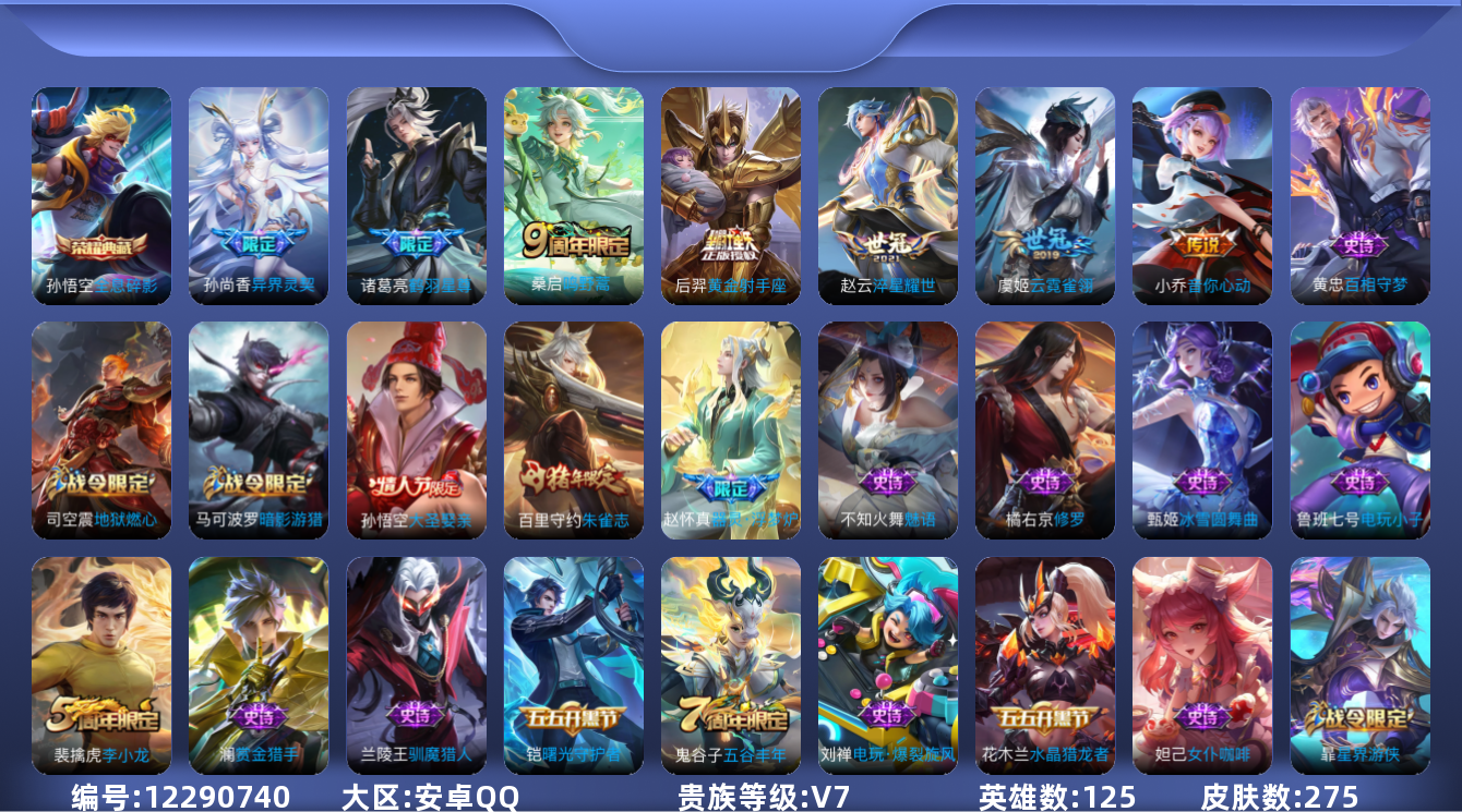 [12290740]V7 1典藏 7传说 125英雄 275皮肤 可修改实名 优质装备:全息碎影(猴子典藏),黄金射手座,云霓雀翎,音你心动-小乔,淬星耀世,鹤羽星尊 珍宝阁皮:胡桃夹子,蔷薇恋人,玩趣恶龙 限定皮:鸣野蒿,异界灵契(白毛香),高山流水,五谷丰年,梁祝,李小龙,朱雀志(守约年限),大圣娶亲 史诗皮:器灵·浮梦炉,星界战将,蔬乡物语(鲁班七号),百相守梦-百里守约,百相守梦-黄忠,苍穹之光,电玩小子(小书包),特工魅影,千年之狐,江河有灵,闲日渔趣,魅语,蒙恬荣光圣徽,偶像歌手,电玩·爆裂旋风,猫狗日记-孙策,乱世虎臣,节奏热浪,修罗,女仆咖啡,摇滚巨星,水果甜心,星夜王子,心灵骇客,功夫厨神,德古拉伯爵,暗隐猎兽者,幽灵船长,鬼剑武藏,心灵战警,天秀·启明,地狱岩魂,繁星吟游(呼啦呼啦),缤纷独角兽,乘风破浪,逐浪之夏,水晶猎龙者,曙光守护者,箭羽风息,唤灵魅影,金属风暴,原初追逐者,圣诞恋歌,鹰眼统帅,魅力维加斯,黎明之约,赏金猎手,未来纪元-赵云
