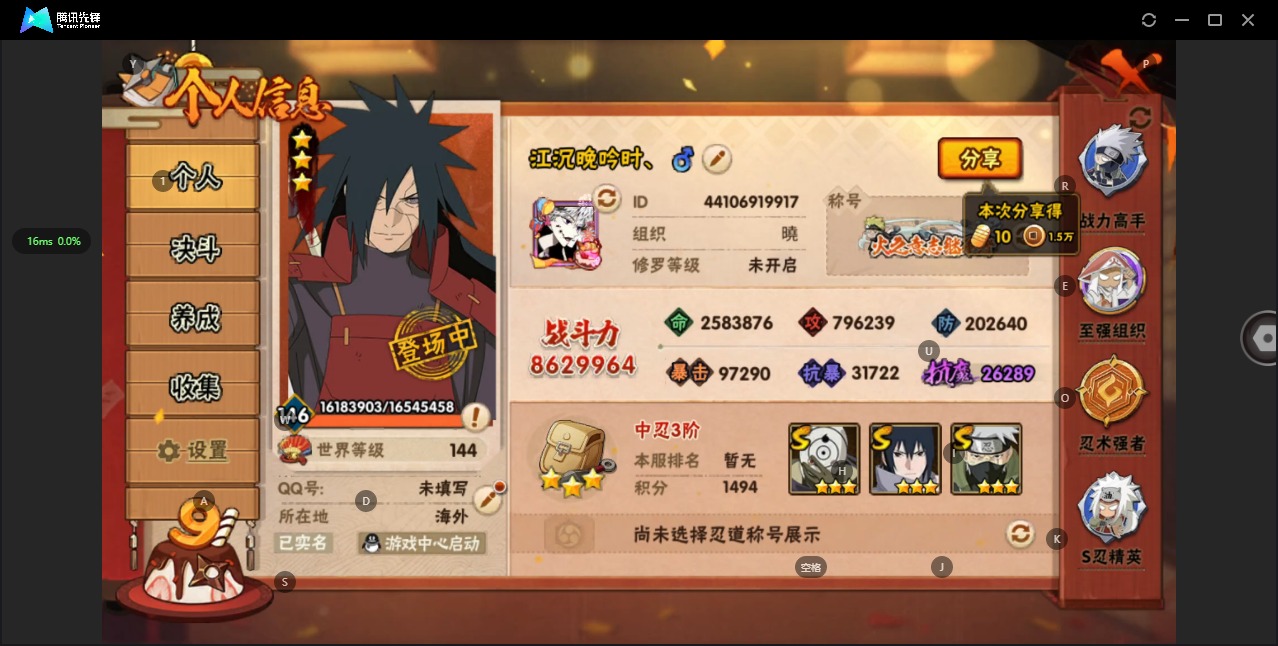 [12290822]V10 16S忍 28A忍 19通灵 862.9W战力 可二次 可修改实名 优质装备:熊猫,纲手「百豪」,波风水门「秽土转生」,猿飞日斩「秽土转生」,长门「秽土转生」,“宇智波斑” 「白面具」,宇智波佐助「永恒万花筒」,千手柱间·木叶创立,宇智波斑「秽土转生·解」,大筒木桃式,艾「忍界大战」,旗木卡卡西「须佐能乎」 S级忍者:自来也 「舞之豪杰」,宇智波鼬 「须佐能乎」,佩恩「天道」,波风水门,自来也