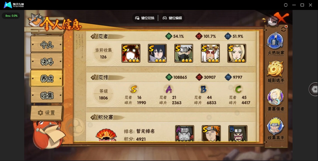 [12290844]V11 16S忍 21A忍 17通灵 952W战力 可二次 可修改实名 优质装备:熊猫,药师兜「仙人模式」,无「二代目土影」,长门「秽土转生」,宇智波斑,千手柱间,“宇智波斑” 「白面具」,宇智波佐助「永恒万花筒」,大筒木桃式,宇智波止水「须佐能乎」,旗木卡卡西「须佐能乎」,大筒木舍人 「最终章」,漩涡鸣人 「暴怒·第六尾」 S级忍者:自来也 「舞之豪杰」,宇智波鼬 「须佐能乎」,佩恩「天道」,纲手
