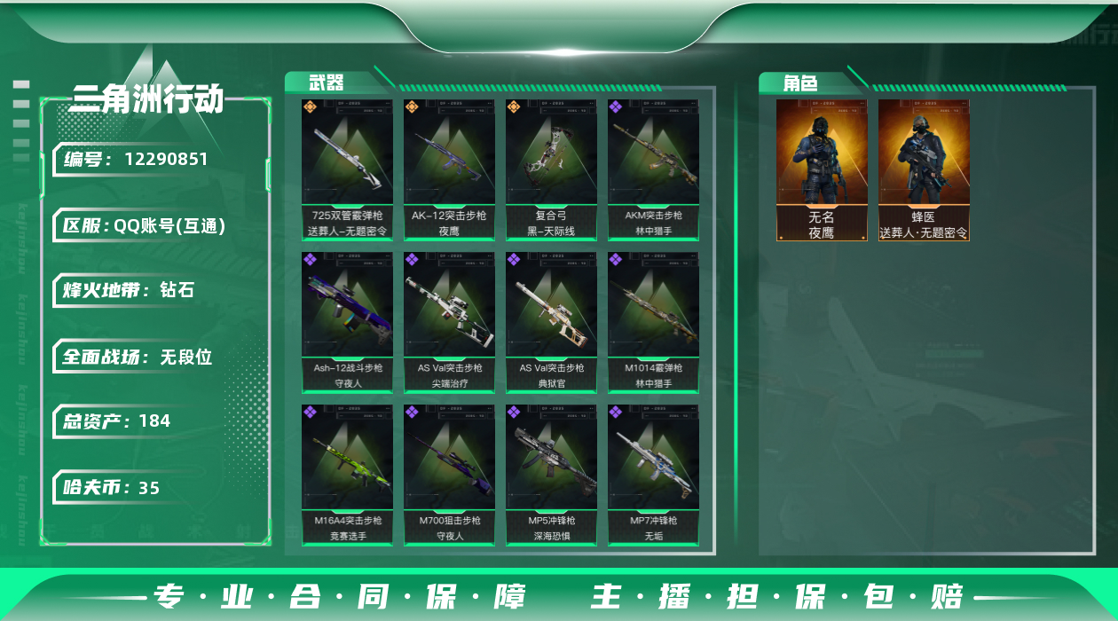 [12290851]总资产:184.8 2干员外观 3传说枪械 顶级安全箱(3×3)9.15号到期 可二次 可修改实名 烽火地带段位:钻石 全面战场段位:无段位 哈夫币:35.206 传说武器皮肤:AK-12突击步枪-夜鹰,复合弓-黑-天际线,725双管霰弹枪-送葬人-无题密令 史诗武器皮肤:SR-25射手步枪-尖端治疗,PKM通用机枪-荒野求生,AS Val突击步枪-尖端治疗,M700狙击步枪-守夜人,SG552突击步枪-尖端治疗,Ash-12战斗步枪-守夜人,MP5冲锋枪-深海恐惧,SR-3M紧凑突击步枪-荒野求生,AKM突击步枪-林中猎手,M16A4突击步枪-竞赛选手,PKM通用机枪-守夜人,SVD狙击步枪-荒野求生,M1014霰弹枪-林中猎手,SV-98狙击步枪-林中猎手,PTR-32突击步枪-英雄,PSG-1射手步枪-无垢,AS Val突击步枪-典狱官,SV-98狙击步枪-囚徒,腾龙突击步枪-无垢,MP7冲锋枪-无垢,SVD狙击步枪-阿萨拉工艺 干员外观:无名-夜鹰,蜂医-送葬人·无题密令(S5)