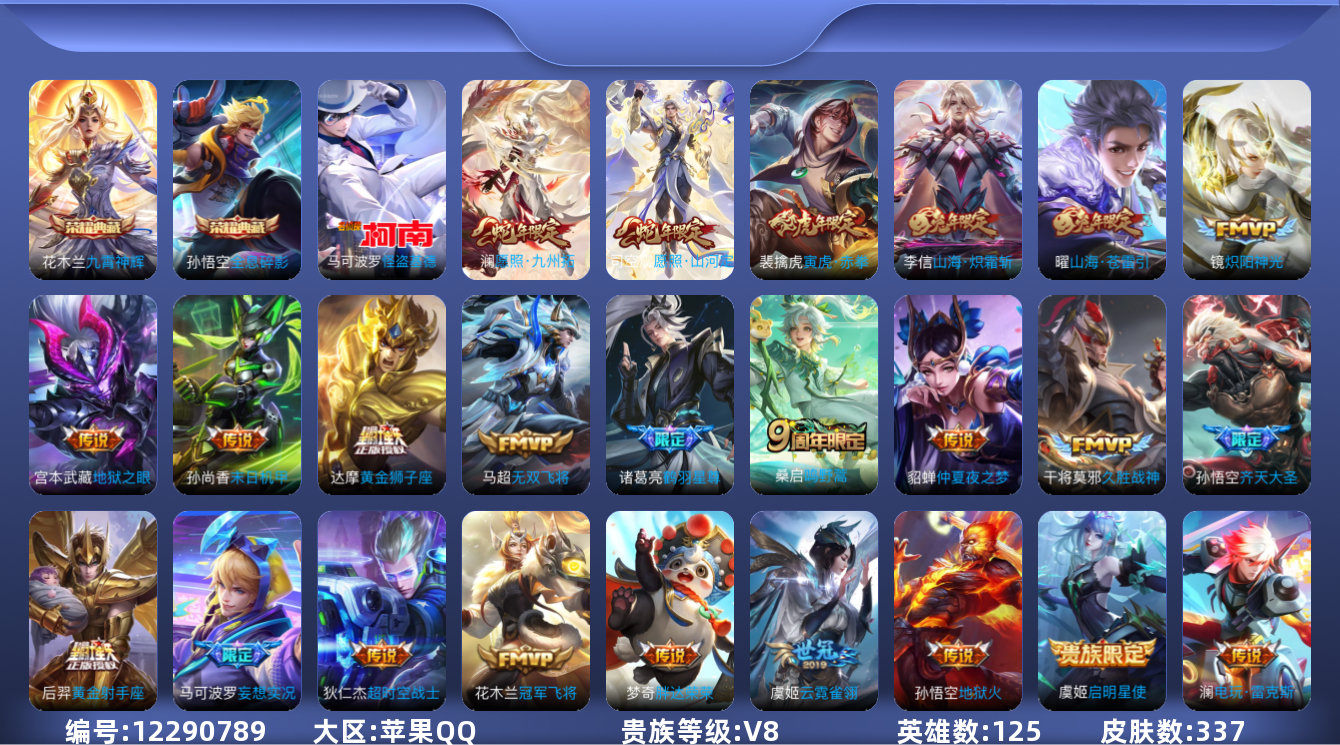 [12290789]V8 2典藏 1珍品传说 24传说 125英雄 337皮肤 可修改实名 优质装备:全息碎影(猴子典藏),九霄神辉(木兰典藏),怪盗基德,黄金狮子座,黄金射手座,冠军飞将,久胜战神,炽阳神光,云霓雀翎,末日机甲-孙尚香(绿蚂蚱),地狱火,仲夏夜之梦(大飞蛾),地狱之眼,胖达荣荣,超时空战士-狄仁杰,无双飞将,山海·炽霜斩(李信年限),山海·苍雷引(电光曜子),电玩·雷克斯,鹤羽星尊,妄想实况 珍宝阁皮:优雅恋人,玩趣恶龙 限定皮:愿照·九州拓(澜年限),愿照·山河定(司空震年限),鸣野蒿,至尊宝,遇见飞天,齐天大圣,五谷丰年,游园惊梦,梁祝,御风骁将(吕布年限),李小龙,孙行者,大圣娶亲,引擎之心,神奇女侠,美猴王,寅虎·赤拳(老虎年限),时之祈愿-云中君,玉兔公主 史诗皮:器灵·浮梦炉,破空之剑,怒海争锋,谪仙醉月,超元猎域,紫霞仙子,苍穹之光,电玩小子(小书包),白龙吟,黄金分割率,特工魅影,千年之狐,百相守梦(刘备),电玩·爆裂旋风,真我赫兹(百里守约),江河有灵,高渐离燃音魔法,蒙恬荣光圣徽,偶像歌手,白蛇,魅语,晚萤,青蛇,末日机甲-吕布,猫狗日记-孙策,猫狗日记-大乔,乱世虎臣,节奏热浪,修罗,女仆咖啡,摇滚巨星,水果甜心,绅士熊喵,天才门将,星夜王子,心灵骇客,功夫厨神,德古拉伯爵,暗隐猎兽者,幽灵船长,鬼剑武藏,暗渊魔法,心灵战警,天秀·启明,舞动绿茵,地狱岩魂,纤云弄巧,繁星吟游(呼啦呼啦),缤纷独角兽,乘风破浪,逐浪之夏,水晶猎龙者,曙光守护者,热力回旋,箭羽风息,金属风暴,原初追逐者,圣诞狂欢,圣诞恋歌,鹰眼统帅,暗夜贵公子,魅力维加斯,黎明之约,赏金猎手,无心,未来纪元-赵云