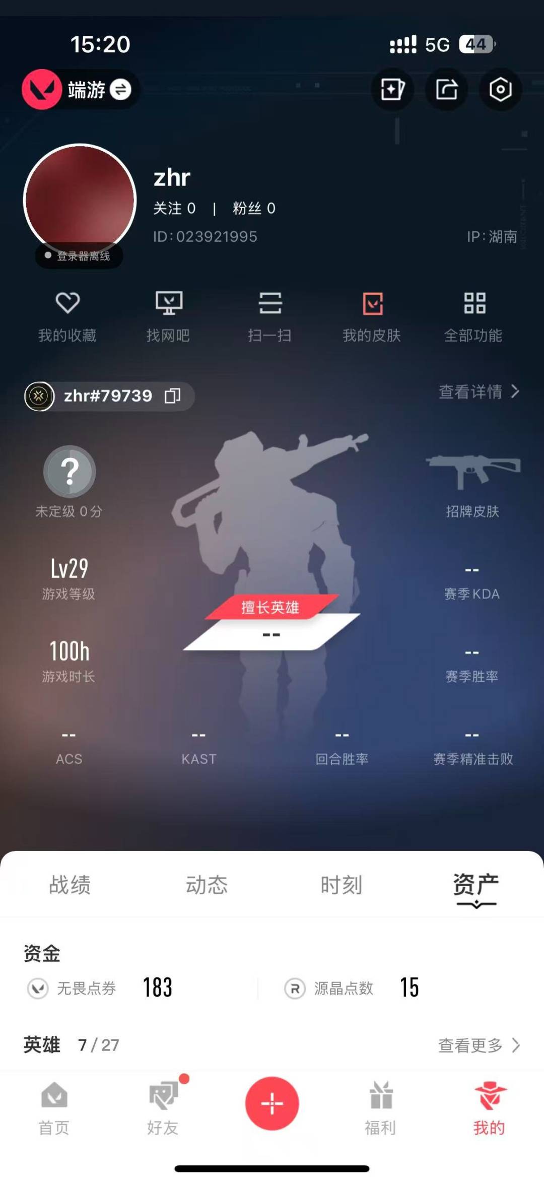 [12290799]10橙皮 2金皮 2紫皮 34皮肤 7英雄 32卡面 355已用源晶 未定级 优质装备:冥驹-光明哨兵,正义-塑水宗,狂徒-日冕雄师,判官-全息波普 亮点皮肤:幻影-2022全球冠军赛,2022全球冠军赛 蝴蝶刀 套装:2022全球冠军赛 佩枪皮肤:标配-VCT25xEDG,鬼魅-超时空卫队,标配-VCT25xWOL 步枪皮肤:狂徒-般若假面//2.0,狂徒-超时空卫队,獠犬-电音光谱 狙击枪皮肤:莽侠-创·纪元