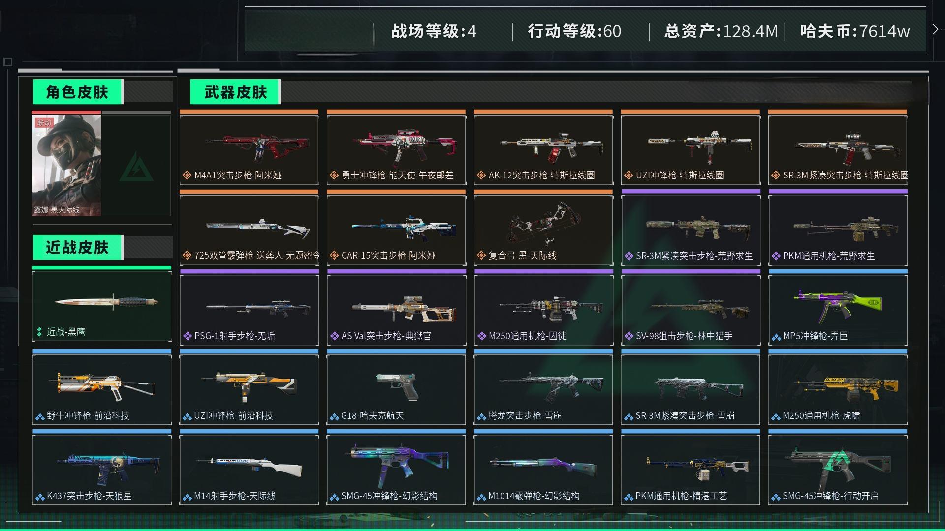 [12291115]三角洲行动-QQ 总资产128M,哈夫币7614w,枪皮数量69,战场等级:4 无军衔,行动等级:60 青铜,角色皮肤数量1,露娜-黑天际线,近战-黑鹰 【哈夫币】7614w 【总资产】128M 【烽火地带专区】总资产100M-150M 【货币】0三角币/0曼德尔币/280三角券 【安全箱】基础安全箱2(1x2) 【通行证】通行证免费版 【特勤处】制药台Lv.2/工作台Lv.2/仓库Lv.6/防具台Lv.3/训练中心Lv.4/靶场Lv.4/技术中心Lv.1/指挥中心Lv.2/潜水中心Lv.0/收藏室Lv.0 【角色皮肤】露娜-黑天际线/ 【已拥有捆绑包】特斯拉线圈捆绑包/ 【近战皮肤】近战-黑鹰/ 【步枪皮肤】AS Val突击步枪-典狱官/SR-3M紧凑突击步枪-荒野求生/CAR-15突击步枪-阿米娅/M4A1突击步枪-阿米娅/AK-12突击步枪-特斯拉线圈/SR-3M紧凑突击步枪-特斯拉线圈/ 【冲锋枪皮肤】UZI冲锋枪-特斯拉线圈/勇士冲锋枪-能天使-午夜邮差/ 【霰弹枪皮肤】725双管霰弹枪-送葬人-无题密令/ 【轻机枪皮肤】PKM通用机枪-荒野求生/M250通用机枪-囚徒/ 【精准射手步枪皮肤】PSG-1射手步枪-无垢/ 【狙击步枪皮肤】SV-98狙击步枪-林中猎手/ 【特殊武器】复合弓-黑-天际线/ 【挂饰】王国利刃/持剑者/阿萨拉喷火兵/阿萨拉盾兵/阿萨拉霰弹兵/阿萨拉狙击兵/挂饰-能天使/挂饰-特斯拉线圈/阿萨拉徽章