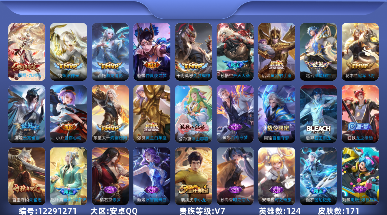 - PX_2105711-实名: 可修改 贵族等级: V6 英雄数: 124 皮肤数: 187 限定皮: 遇见飞天,梁祝,飞衡,至尊宝,五谷丰年