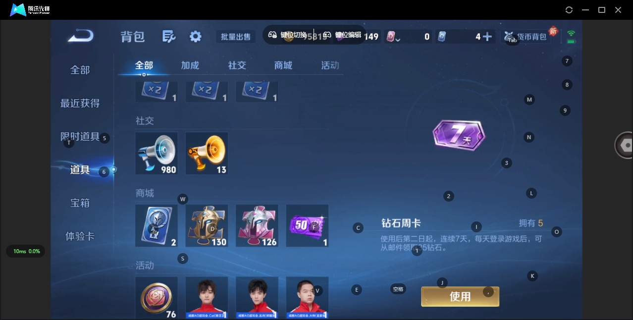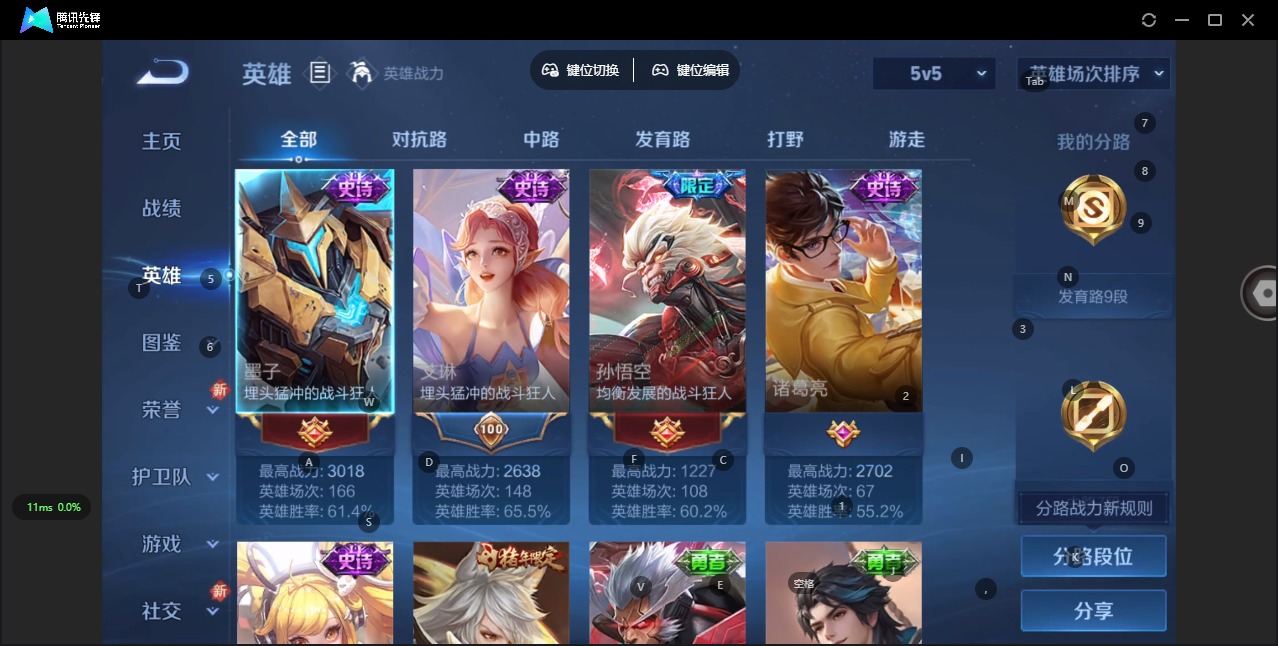 - [11970943]V5 3传说 74英雄 47皮肤 可修改实名 优质装备:无双飞将,澜逐花归海,涂山容容 限定皮:逐霄战戟,鸣野蒿 史诗皮:赞萌露比,谪仙醉月,百相守梦-周瑜,百相守梦-黄忠,黄金分割率,水果甜心,暗隐猎兽者,鬼剑武藏,逐浪之夏,月团寄思,水晶猎龙者,曙光守护者,鹰眼统帅,魅力维加斯