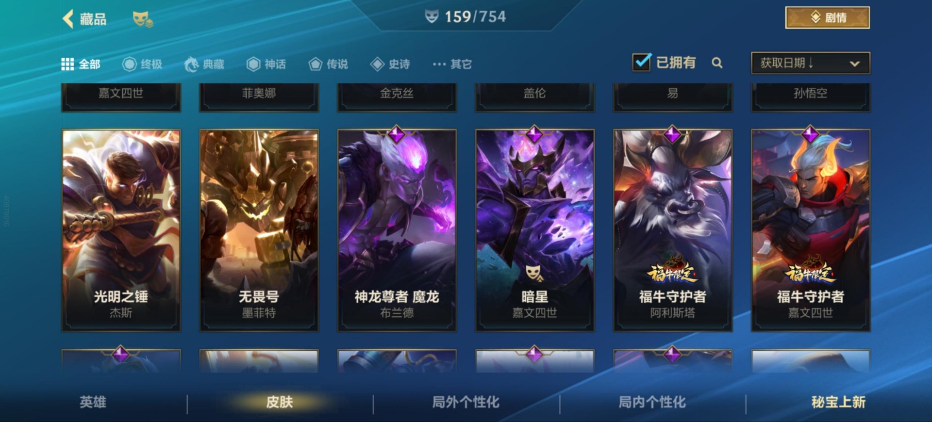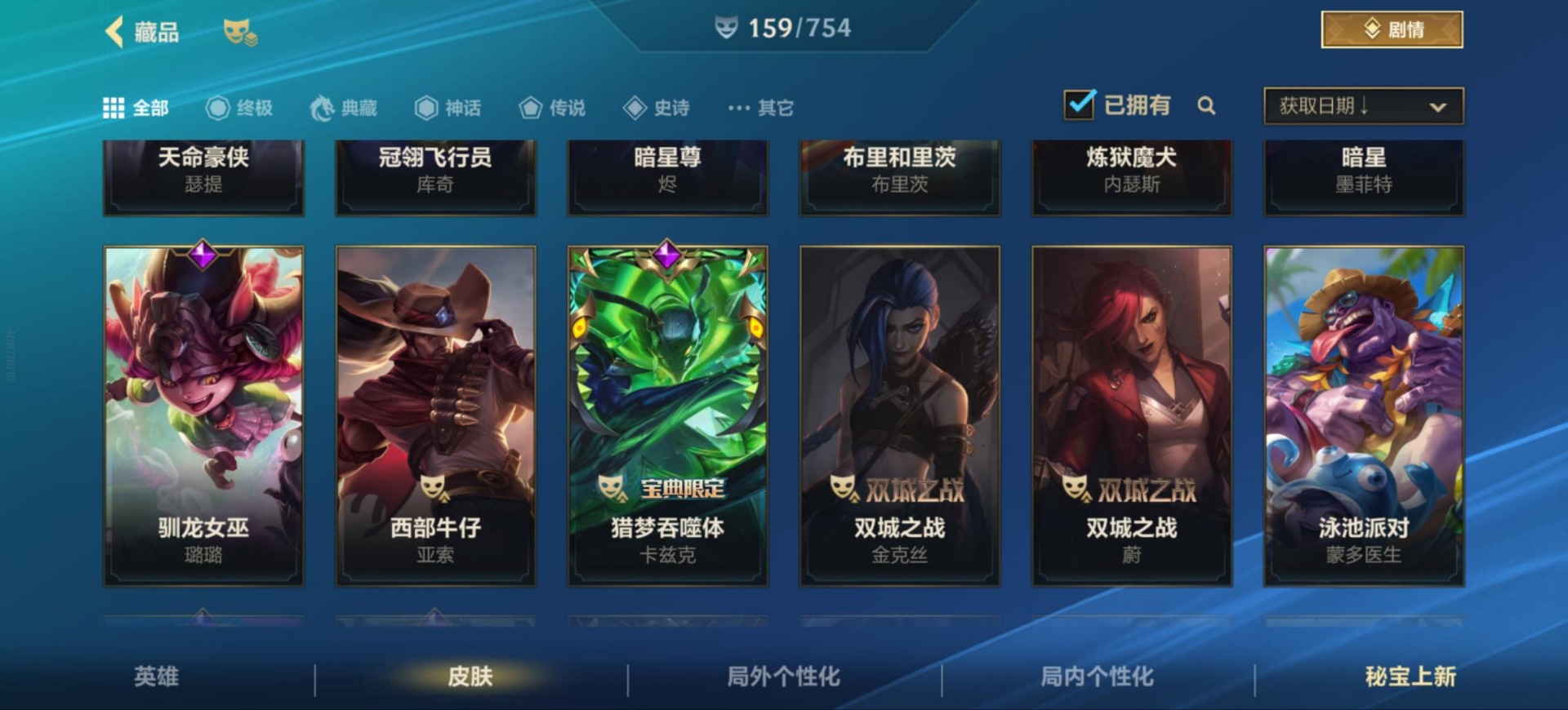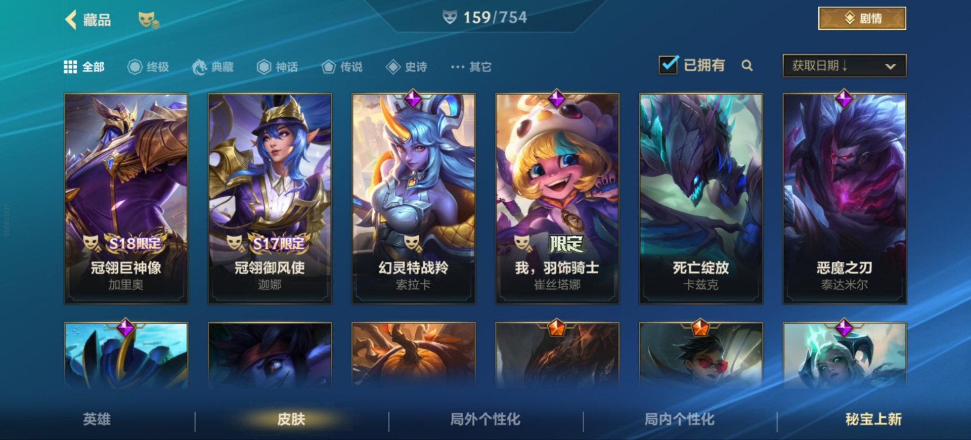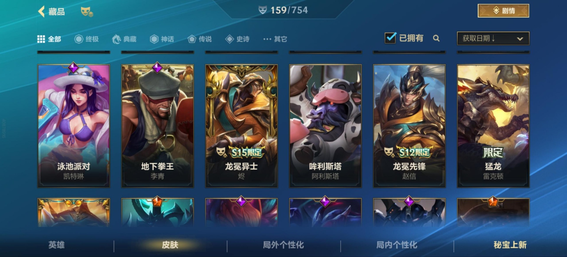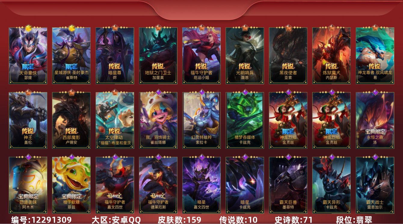 [12291309]2神话 1限定 10传说 71史诗 159皮肤 可二次 可修改实名 优质装备:暗星尊,福牛守护者女枪,光明哨兵薇恩,黑夜使者亚索,炼狱魔犬,神龙尊者 驭风啸龙,神王盖伦,西部魔影卢锡安,星域游侠卡牌圣时豪杰 段位:翡翠 神话皮:天命豪侠 瑟提 限定皮肤:神龙烈焰金克丝 传说皮:地狱之门卫士,太空律动机器人