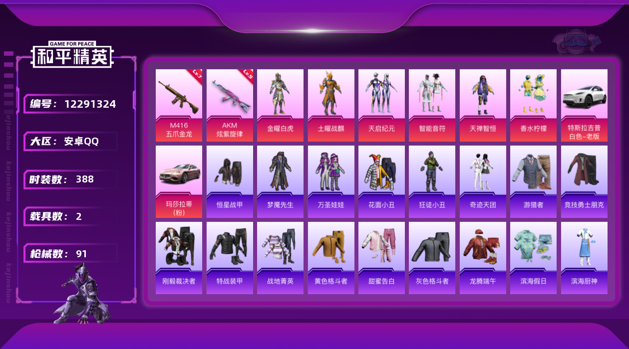 - PX_2017781- 苹果手Q-20王牌印记-8粉装-4特效枪-3载具-87943热力值-201套装-240枪皮-1卓越印记-0传奇印记 【8粉装】,梦幻火箭,冷漠罗丽,恐龙拽拽,暗夜玫瑰,甜梦冰蝶,山涧鹿灵,吟月归客,未来歌姬 【4特效枪】AKM-梦之光华-7级 SCAR-L-青春物语-6级 M416-心之恋语-7级 Kar98K-巳巳如意-5级 【7稀有紫装】,暗影哥特,浪漫天命,雪山精英