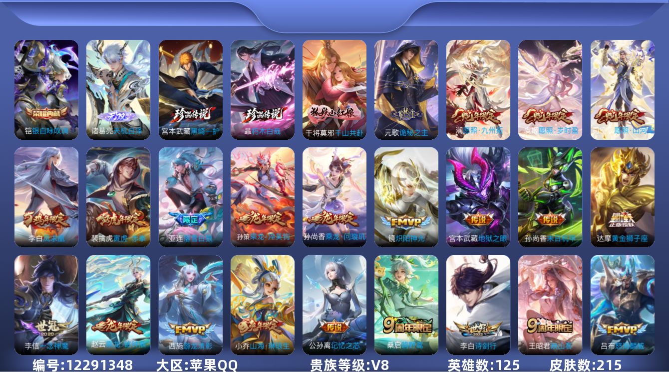 [12291348]V8 1典藏 1无双 2珍品传说 30传说 125英雄 215皮肤 可修改实名 优质装备:银白咏叹调(倪克斯侍卫),天机白泽,朽木白哉,黑崎一护,黄金狮子座,绛天战甲(鸡嘴战神),猫影幻舞,炽阳神光,一念神魔,末日机甲-孙尚香(绿蚂蚱),地狱之眼,时之恋人-刘备(电焊工),游龙清影(小青龙),山海·琳琅生(小乔年限),记忆之芯(机甲兔),妄想实况,鲁班七号-时之奇旅,诡秘之主,千山共赴,涂山容容 传说皮:乘龙·问璇玑(孙尚香年限),乘龙·铭钟鼎(赵云年限),乘龙·淬吴钩(孙策年限),落雪白狼 珍宝阁皮:蔷薇恋人 限定皮:愿照·九州拓(澜年限),愿照·岁时盈(虞姬年限),愿照·山河定(司空震年限),映山客,鸣野蒿,至尊宝,凤求凰(白切鸡),至美·化雀舞,诗剑行,怒海麟威,五谷丰年,辉光之辰,大圣娶亲,寅虎·赤拳(老虎年限) 史诗皮:鸭鸭历险记-刘禅,化蝶舞,星界战将,谪仙醉月,龙之律动,石田雨龙,百相守梦-周瑜,百相守梦-黄忠,织梦人,守夜人,紫霞仙子,黄金分割率,特工魅影,千年之狐,匿光侦查者,魅语,高渐离燃音魔法,青蛇,偶像歌手,晚萤,节奏热浪,摇滚巨星,水果甜心,天才门将,星夜王子,心灵骇客,功夫厨神,暗隐猎兽者,鬼剑武藏,暗渊魔法,心灵战警,地狱岩魂,乘风破浪,逐浪之夏,水晶猎龙者,曙光守护者,箭羽风息,金属风暴,原初追逐者,圣诞恋歌,鹰眼统帅,暗夜贵公子,魅力维加斯