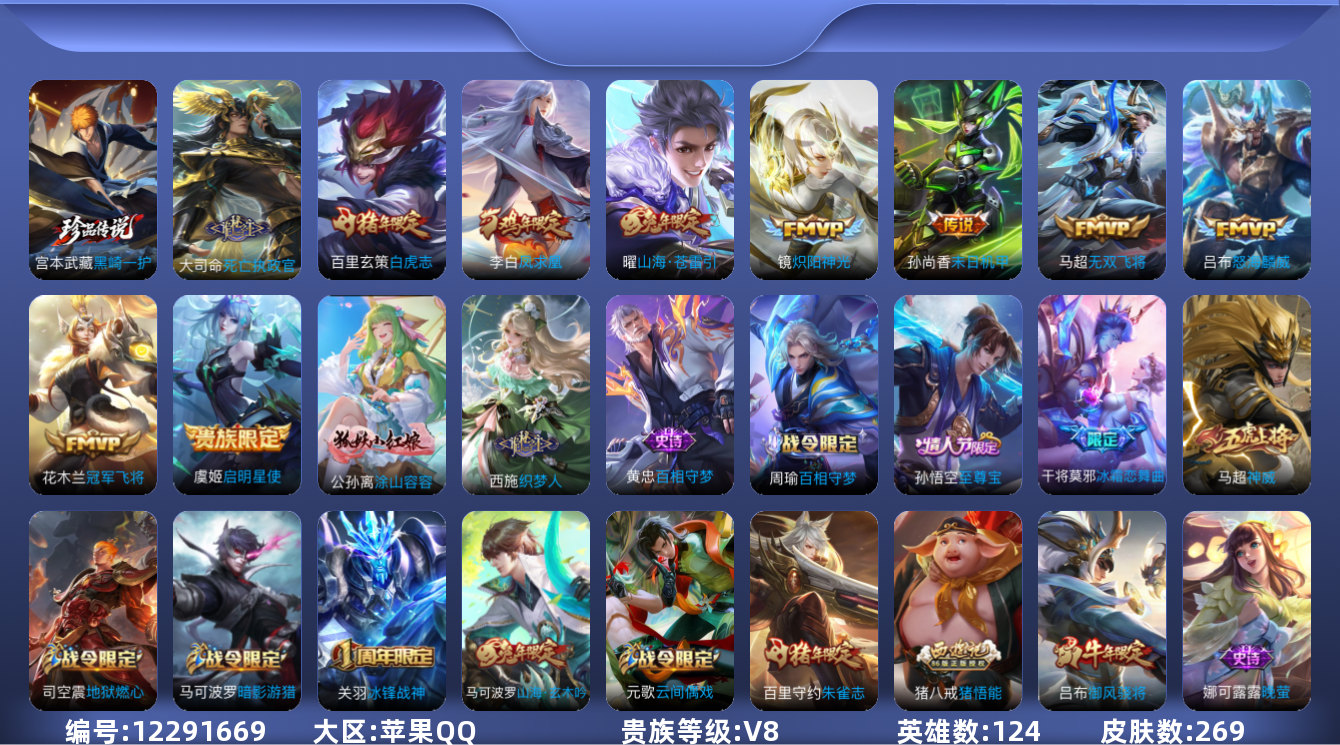 [12291669]V8 1珍品传说 10传说 124英雄 269皮肤 可修改实名 优质装备:黑崎一护,冠军飞将,炽阳神光,末日机甲-孙尚香(绿蚂蚱),无双飞将,山海·苍雷引(电光曜子),涂山容容 传说皮:死亡执政官 珍宝阁皮:优雅恋人,玩趣恶龙 限定皮:至尊宝,白虎志(电光耗子),凤求凰(白切鸡),神威(电光马子),怒海麟威,五谷丰年,冰锋战神,御风骁将(吕布年限),李小龙,朱雀志(守约年限),猪悟能,冰霜恋舞曲,山海·玄木吟(马可年限) 史诗皮:百相守梦-周瑜,百相守梦-黄忠,织梦人,紫霞仙子,苍穹之光,江河有灵,魅语,蒙恬荣光圣徽,冰冠公主,偶像歌手,晚萤,龙骑士(小龙虾),猫狗日记-孙策,乱世虎臣,节奏热浪,修罗,女仆咖啡,水果甜心,星夜王子,心灵骇客,功夫厨神,德古拉伯爵,幽灵船长,鬼剑武藏,地狱岩魂,纤云弄巧,繁星吟游(呼啦呼啦),水晶猎龙者,金属风暴,原初追逐者,圣诞狂欢,鹰眼统帅,魅力维加斯,黎明之约,无心