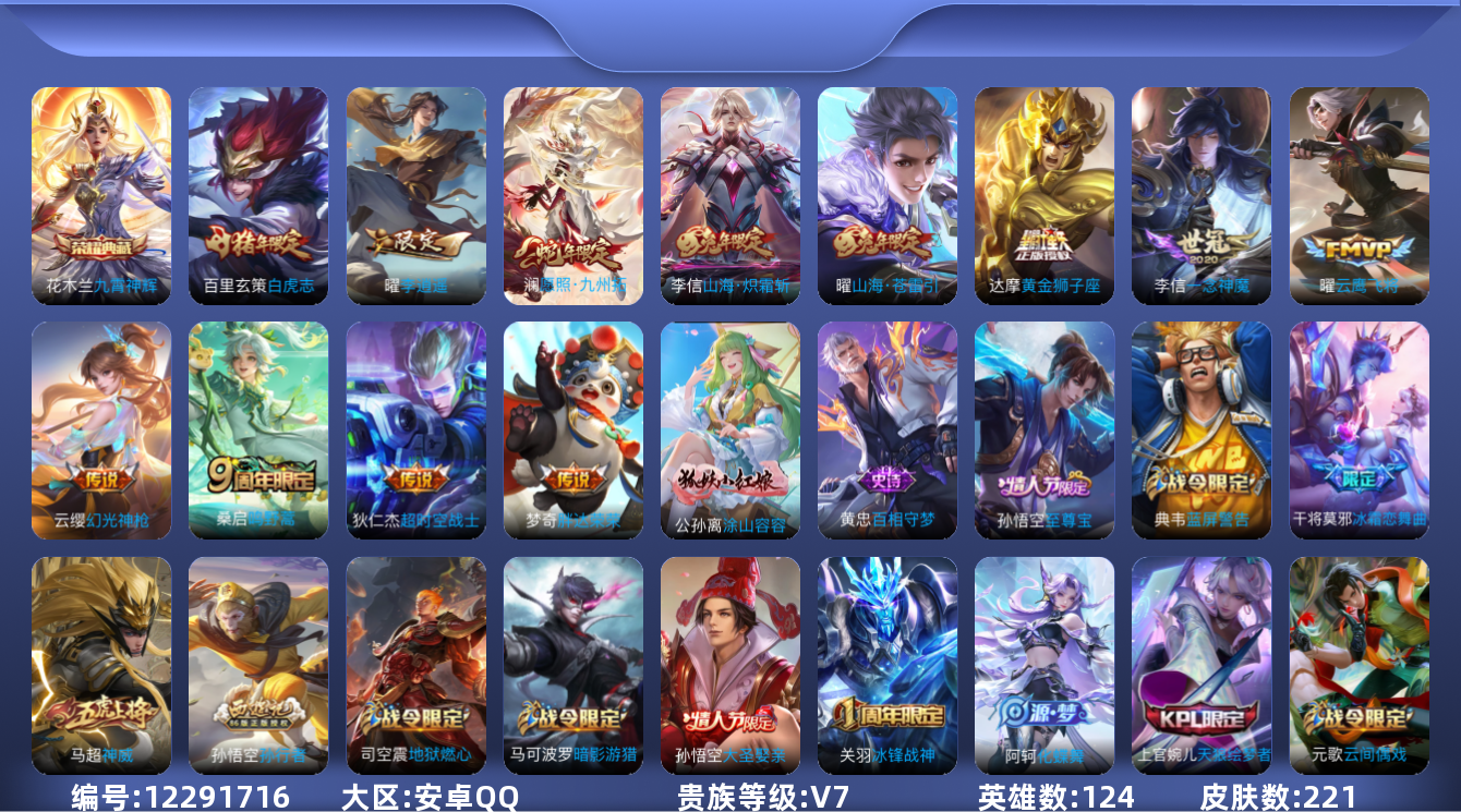 [12291716]V7 1典藏 12传说 124英雄 221皮肤 可修改实名 优质装备:九霄神辉(木兰典藏),黄金狮子座,云鹰飞将(小将军),一念神魔,胖达荣荣,李逍遥,超时空战士-狄仁杰,山海·炽霜斩(李信年限),山海·苍雷引(电光曜子),涂山容容 传说皮:幻光神枪 珍宝阁皮:万物之道,蔷薇恋人,玩趣恶龙 限定皮:愿照·九州拓(澜年限),逐霄战戟,鸣野蒿,至尊宝,白虎志(电光耗子),白晶晶,神威(电光马子),高山流水,五谷丰年,冰锋战神,梁祝,御风骁将(吕布年限),天狼绘梦者,李小龙,孙行者,大圣娶亲,冰霜恋舞曲,美猴王,神器·万象笔 史诗皮:化蝶舞,星界战将,琥珀纪元伽罗,上官婉儿群星魔术团,百相守梦-黄忠,特工魅影,百解令(蒙犽),高渐离燃音魔法,蒙恬荣光圣徽,时之恋人-孙尚香,修罗,水果甜心,星夜王子,德古拉伯爵,暗隐猎兽者,幽灵船长,鬼剑武藏,心灵战警,天秀·启明,舞动绿茵,地狱岩魂,繁星吟游(呼啦呼啦),乘风破浪,逐浪之夏,水晶猎龙者,曙光守护者,金属风暴,原初追逐者,圣诞狂欢,鹰眼统帅,魅力维加斯,黎明之约,赏金猎手,无心