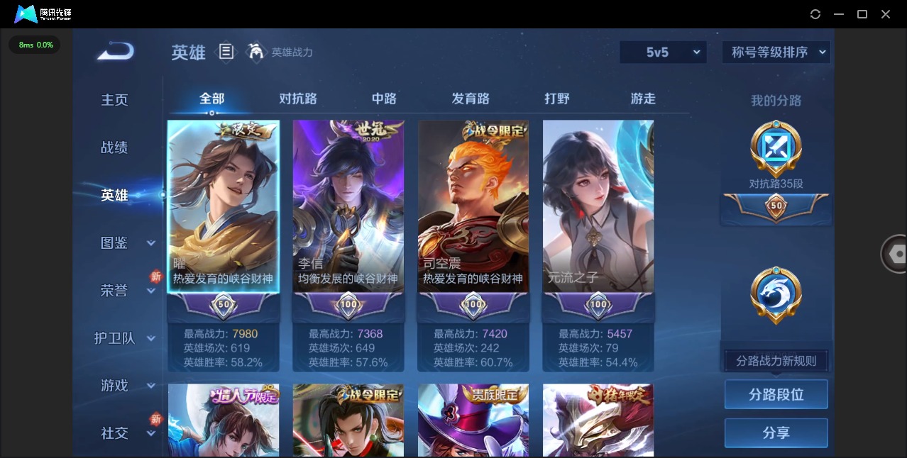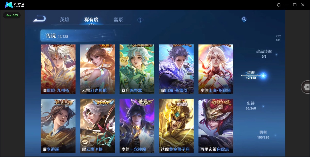 - [11684328]V8 1典藏 22传说 124英雄 248皮肤 可修改实名 优质装备:鸣剑·曳影,黄金狮子座,冠军飞将,云鹰飞将(小将军),猫影幻舞,久胜战神,炽阳神光,一念神魔,时之恋人-刘备(电焊工),超时空战士-狄仁杰,无双飞将,山海·炽霜斩(李信年限),浮生妄,鹤羽星尊,澜逐花归海 传说皮:乘龙·淬吴钩(孙策年限) 珍宝阁皮:万物之道,玩趣恶龙 限定皮:愿照·九州拓(澜年限),鸣野蒿,异界灵契(白毛香),遇见飞天,怒海麟威,五谷丰年,冰锋战神,游园惊梦,梁祝,逐梦之星,逐梦之影,永曜之星,深海之息(深海大菠萝),山海·玄木吟(马可年限) 史诗皮:器灵·浮梦炉,星界战将,龙之律动,幻珠鲛人,蔬乡物语(鲁班七号),百相守梦-黄忠,织梦人,紫霞仙子,特工魅影,千年之狐,江河有灵,魅语,百解令(蒙犽),高渐离燃音魔法,蒙恬荣光圣徽,偶像歌手,晚萤,电玩·爆裂旋风,末日机甲-吕布,猫狗日记-孙策,猫狗日记-大乔,时之恋人-孙尚香,乱世虎臣,节奏热浪,修罗,女仆咖啡,摇滚巨星,水果甜心,绅士熊喵,星夜王子,心灵骇客,功夫厨神,暗隐猎兽者,幽灵船长,鬼剑武藏,暗渊魔法,心灵战警,舞动绿茵,地狱岩魂,纤云弄巧,繁星吟游(呼啦呼啦),缤纷独角兽,乘风破浪,逐浪之夏,月团寄思,水晶猎龙者,热力回旋,金属风暴,原初追逐者,圣诞恋歌,鹰眼统帅,黎明之约,赏金猎手,无心,未来纪元-赵云
