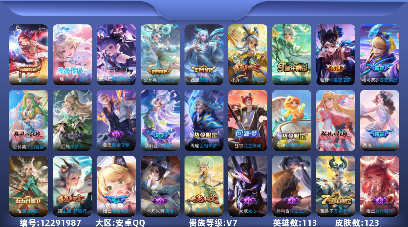 [12291987]V7 1典藏 2珍品传说 6传说 113英雄 123皮肤 可修改实名 优质装备:拾光映像(瑶典藏),酷洛米之心,大耳狗之梦,仲夏夜之梦(大飞蛾),游龙清影(小青龙),山海·琳琅生(小乔年限),妄想实况,涂山容容 传说皮:云诺千山 珍宝阁皮:蔷薇恋人 限定皮:鸣野蒿,山海·碧波行(瑶年限),至美·乘鲤谣,五谷丰年,天狼运算者,时之奇旅-妲己 史诗皮:鸭鸭历险记-刘禅,龙之律动,百相守梦-周瑜,幻珠鲛人,乘龙·忆丹青(大乔年限),涂山红红,百相守梦-黄忠,织梦人,遇见神鹿,魅语,冰冠公主,青蛇,偶像歌手,银翎春语,猫狗日记-孙策,时之恋人-孙尚香,节奏热浪,女仆咖啡,水果甜心,心灵骇客,德古拉伯爵,诗语江南,乘风破浪,逐浪之夏,唤灵魅影,圣诞恋歌,鹰眼统帅,魅力维加斯,无心