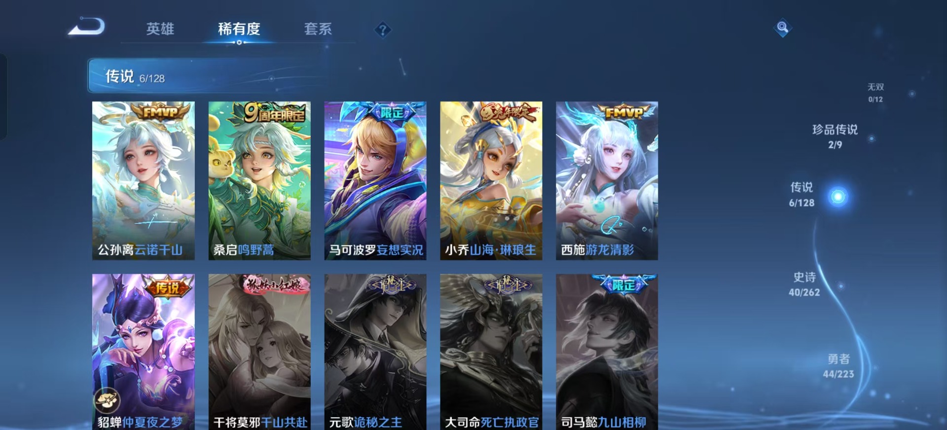- [12226200]V6 2典藏 7传说 124英雄 267皮肤 可修改实名 优质装备:鸣剑·曳影,星域神启(倪克斯贼亮),云鹰飞将(小将军),久胜战神,地狱之眼 传说皮:幻光神枪 珍宝阁皮:蔷薇恋人,女武神 限定皮:愿照·九州拓(澜年限),愿照·山河定(司空震年限),鸣野蒿,遇见飞天,高山流水,五谷丰年,游园惊梦,梁祝,李小龙 史诗皮:器灵·浮梦炉,化蝶舞,灵蛊蚀心,星界战将,龙之律动,石田雨龙,茶境仙,破空之剑,蒙犽顽岩魄,琥珀纪元伽罗,百相守梦-黄忠,白龙吟,黄金分割率,特工魅影,千年之狐,江河有灵,百解令(蒙犽),高渐离燃音魔法,蒙恬荣光圣徽,青蛇,偶像歌手,晚萤,电玩·爆裂旋风,暗夜猫娘,末日机甲-吕布,猫狗日记-孙策,猫狗日记-大乔,乱世虎臣,节奏热浪,修罗,女仆咖啡,水果甜心,绅士熊喵,天才门将,星夜王子,心灵骇客,功夫厨神,德古拉伯爵,暗隐猎兽者,幽灵船长,鬼剑武藏,心灵战警,舞动绿茵,地狱岩魂,繁星吟游(呼啦呼啦),缤纷独角兽,乘风破浪,逐浪之夏,月团寄思,水晶猎龙者,曙光守护者,箭羽风息,金属风暴,原初追逐者,圣诞狂欢,圣诞恋歌,鹰眼统帅,暗夜贵公子,魅力维加斯,黎明之约,无心,未来纪元-赵云