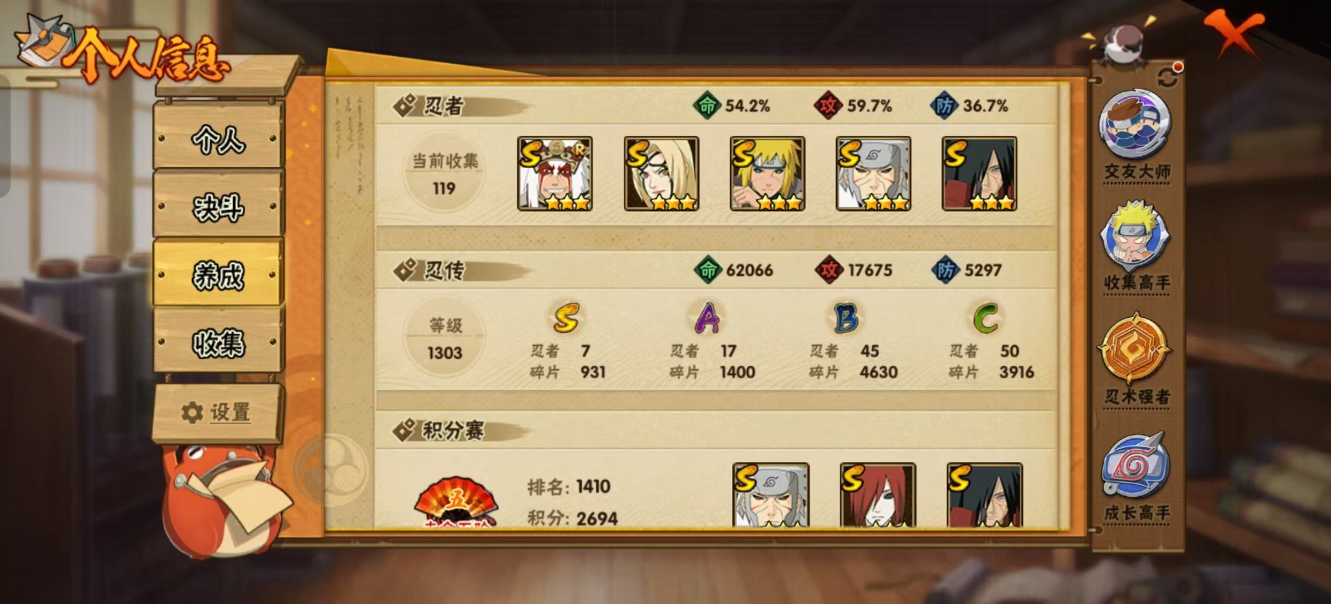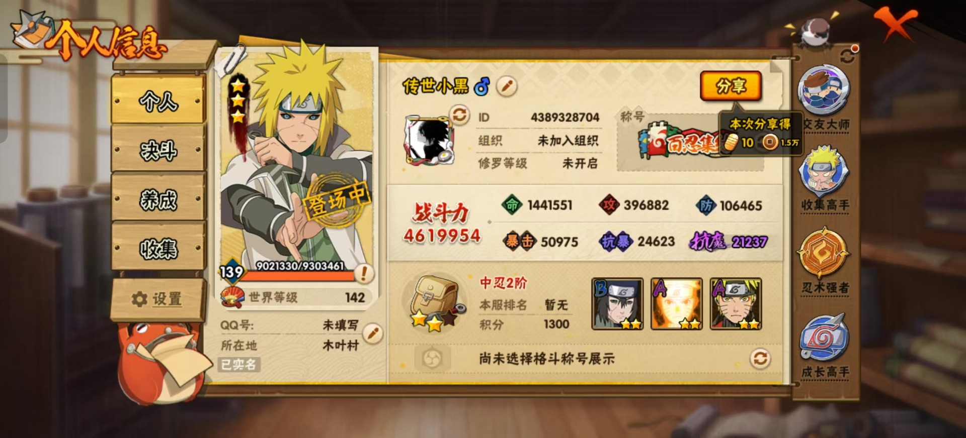 [12292031]V7 7S忍 17A忍 13通灵 461.9W战力 可二次 可修改实名 优质装备:宇智波斑「秽土转生」,千手扉间「秽土转生」,纲手「百豪」,波风水门「秽土转生」,长门「秽土转生」 S级忍者:自来也 「舞之豪杰」,佩恩「天道」