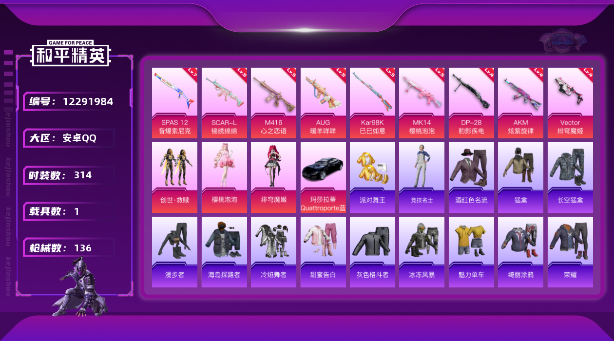 [12291984]3粉装 9特效枪 1载具 8印记 可二次 可修改实名 身法装备:舞王派对(派对舞王、小金鞋),Mark.06(新蓝螳螂) 优质装备:玛莎拉蒂Quattroporte(夜幕蓝),舞王派对(派对舞王、小金鞋),AKM炫紫旋律,M416心之恋语,SPAS-12音爆索尼克,SCAR-L-锦绣绵绵,七级SPAS-12-音爆索尼克,AUG-暖羊咩咩,樱桃泡泡,MK14-樱桃泡泡,绯穹魔姬,Vector-绯穹魔姬,Kar98K-巳巳如意 热门装扮:创世·救赎,派对舞王(小金鞋) 稀有枪皮:DP-28-豹影疾电 五级特效枪:五级M416-心之恋语,五级Kar98K-巳巳如意,五级AUG-暖羊咩咩,五级MK14-樱桃泡泡,五级SCAR-L-锦绣绵绵 四级特效枪:四级AKM-炫紫旋律,四级Vector-绯穹魔姬,四级DP-28-豹影疾电 紫色装扮:SS22特训,SS23特训,幻彩翩翩,妙红点点,SS31特训套装,冷焰舞者,SS30特训套装,云朵鹅,雪绒豹,SS33特训套装,酒红色名流,长空猛禽,霓虹街区,缤纷果语,荣耀,绛羽幽主,飞行日记,魅力单车,鹤鸣,龟仙人,冰河战士,龙魂突击队,蝶变,香桃花海,柠萌假日,沙漠兵团,海岛探路者,涂山之恋,绮丽涂鸦,破蛋小黄鸡,甜蜜告白,空岛之星,王牌教练,灰色格斗者,猛禽,雏菊兔兔,萝兰蝴蝶,SS29特训,纯真浪花,热情海星,SS28特训,Mark.06(新蓝螳螂),鱼渊荷华,燕燕于飞,巳巳如意,青团波波,糖糖葫芦,棉花软糖,竞技名士,摩登魅猫,街头风暴,许七安,神气柴柴,懵萌河马,SS24特训(SS24特训套装),SS25特训,粉红小猪,焰鹰斗篷,幻羽潜行,幽夜迷踪,SS27特训,无暇誓言,蝶吟花词,SS26特训,春光漫游,快闪甜心,智谋强哥,大橘大利,星渊小夜曲,粉恋花,蓝冰羽,紫幽梦,SS32特训服(SS32特训套装),猎影月神,瑰梦爱神,恋语绒绒,双彩圣灵,漫步者,冰冻风暴,光之冒险 优质战备:圣堂之誓降落伞,星之彼岸降落伞,镜域双华降落伞,猪猪侠降落伞,绯穹魔姬降落伞,赛博古神降落伞,智耀战神降落伞,音爆索尼克降落伞,第五大道降落伞