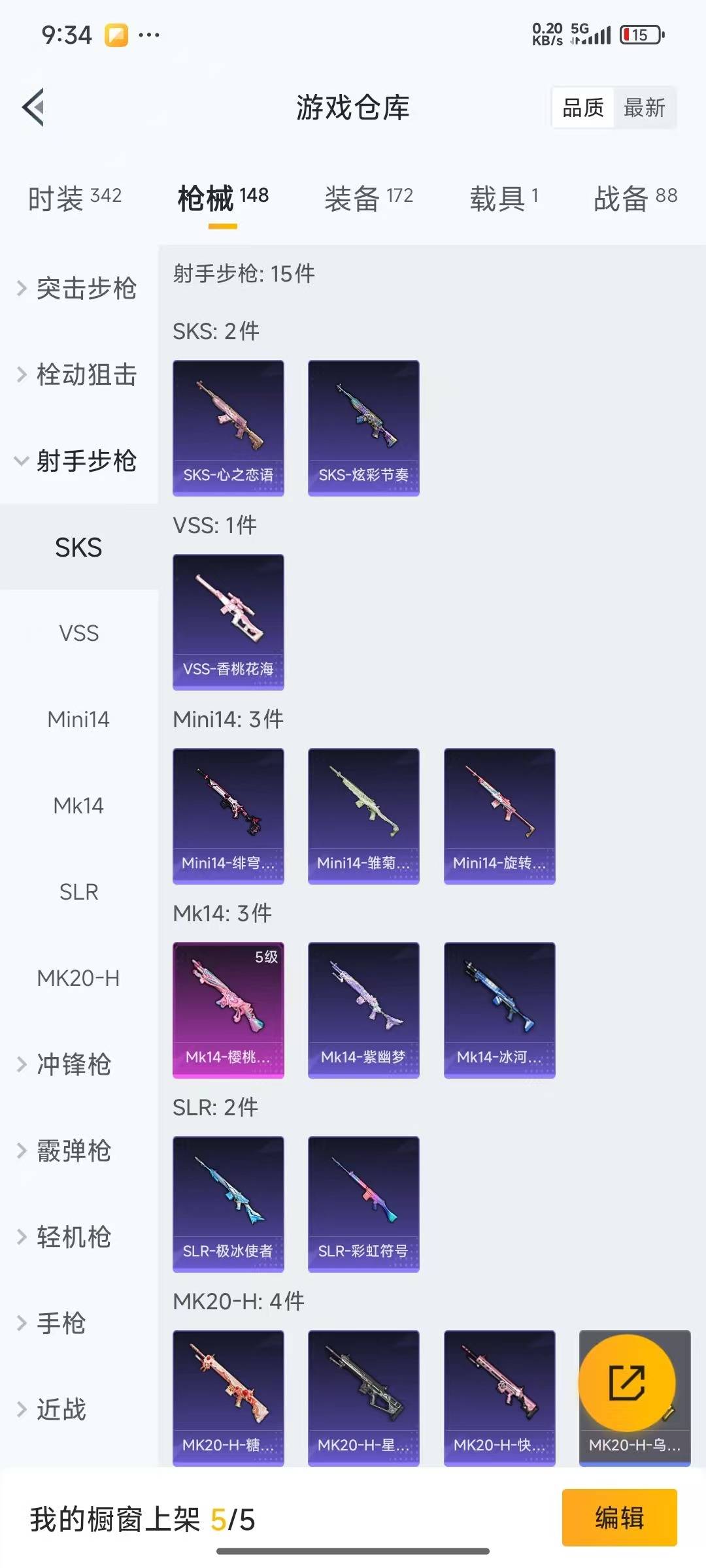 AKM-炫紫旋律,SCAR-L-锦绣绵绵,M416-心之恋语,AUG-暖羊咩咩,Kar98K-巳巳如意,Mk14-樱桃泡泡,SPAS-12-音爆索尼克