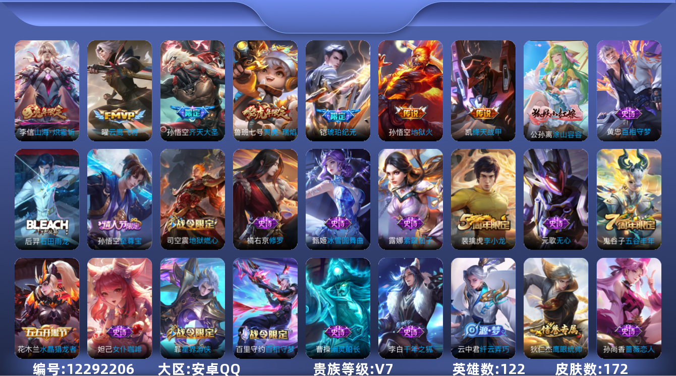 [12292206]V7 7传说 122英雄 172皮肤 可修改实名 优质装备:云鹰飞将(小将军),绛天战甲(鸡嘴战神),地狱火,山海·炽霜斩(李信年限),琥珀纪元铠,涂山容容 珍宝阁皮:胡桃夹子,蔷薇恋人 限定皮:至尊宝,齐天大圣,五谷丰年,梁祝,李小龙,寅虎·瑞焰(虎皮蛋子),神器·万象笔 史诗皮:石田雨龙,茶境仙,上官婉儿群星魔术团,百相守梦-百里守约,百相守梦-黄忠,紫霞仙子,黄金分割率,千年之狐,江河有灵,高渐离燃音魔法,偶像歌手,猫狗日记-孙策,节奏热浪,修罗,女仆咖啡,摇滚巨星,水果甜心,天才门将,星夜王子,德古拉伯爵,暗隐猎兽者,幽灵船长,鬼剑武藏,乐园奇幻夜,天秀·启明,地狱岩魂,纤云弄巧,水晶猎龙者,热力回旋,金属风暴,圣诞狂欢,鹰眼统帅,魅力维加斯,无心,未来纪元-赵云