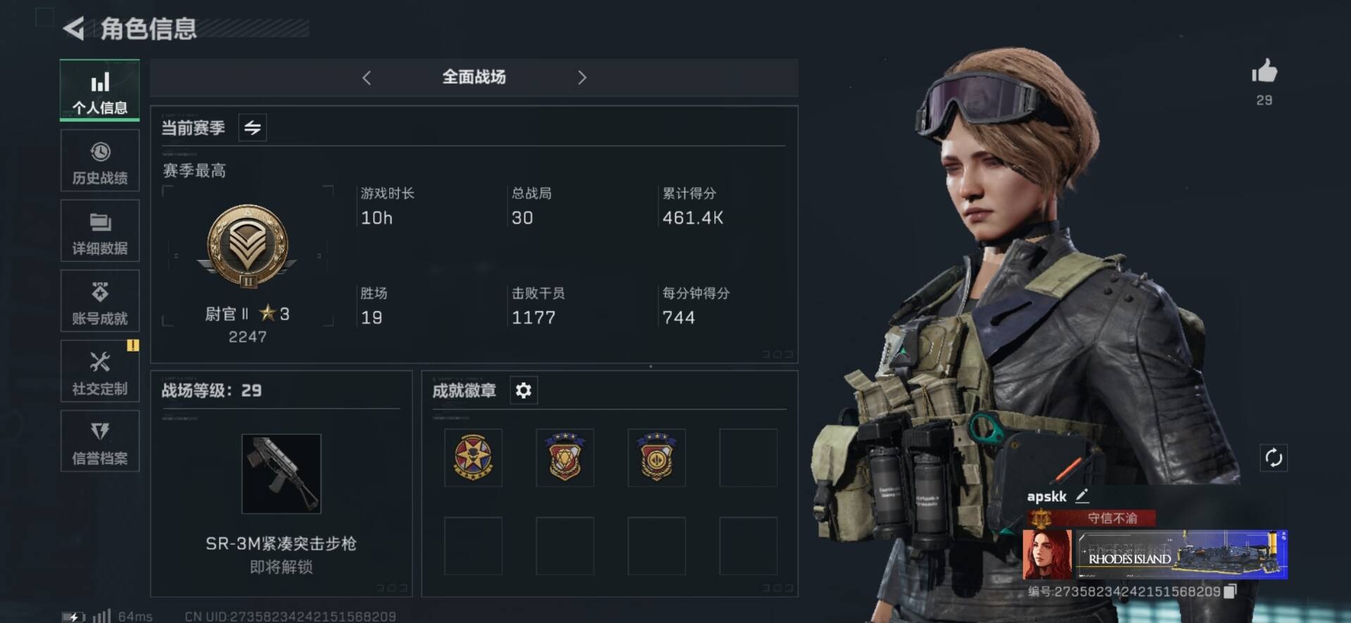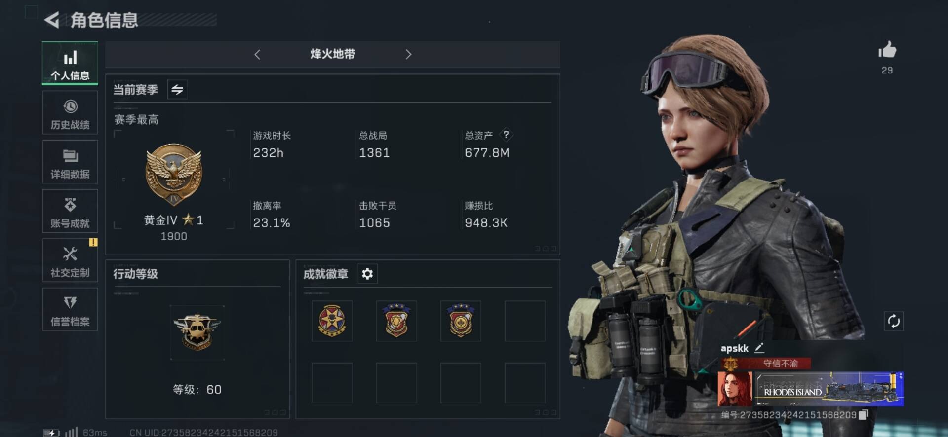 [12292365]总资产:677.8M 1干员外观 12传说枪械 哈夫币:89.634K 可二次 可修改实名 烽火地带段位:黄金 全面战场段位:尉官 传说武器皮肤:SCAR-H战斗步枪-水墨云图,SMG45冲锋枪-骑士,M4A1突击步枪-阿米娅,CAR-15突击步枪-阿米娅,复合弓-黑-天际线,AWM狙击步枪-捞点薯条,腾龙突击步枪-捞点薯条,93R-捞点薯条,AK-12突击步枪-特斯拉线圈,SR-3M紧凑突击步枪-特斯拉线圈,UZI冲锋枪-特斯拉线圈,勇士冲锋枪-能天使-午夜邮差 史诗武器皮肤:M1014霰弹枪-潜袭者,AUG突击步枪-蝮蛇,M700狙击步枪-蝮蛇,勇士冲锋枪-深海恐惧,SG552突击步枪-深海恐惧,AKM突击步枪-林中猎手,M1014霰弹枪-林中猎手,SV-98狙击步枪-林中猎手,PTR-32突击步枪-英雄,SV-98狙击步枪-囚徒,SCAR-H战斗步枪-囚徒,沙漠之鹰-曙光,Vector冲锋枪-阿萨拉文明,SVD狙击步枪-阿萨拉工艺 干员外观:骇爪-水墨云图