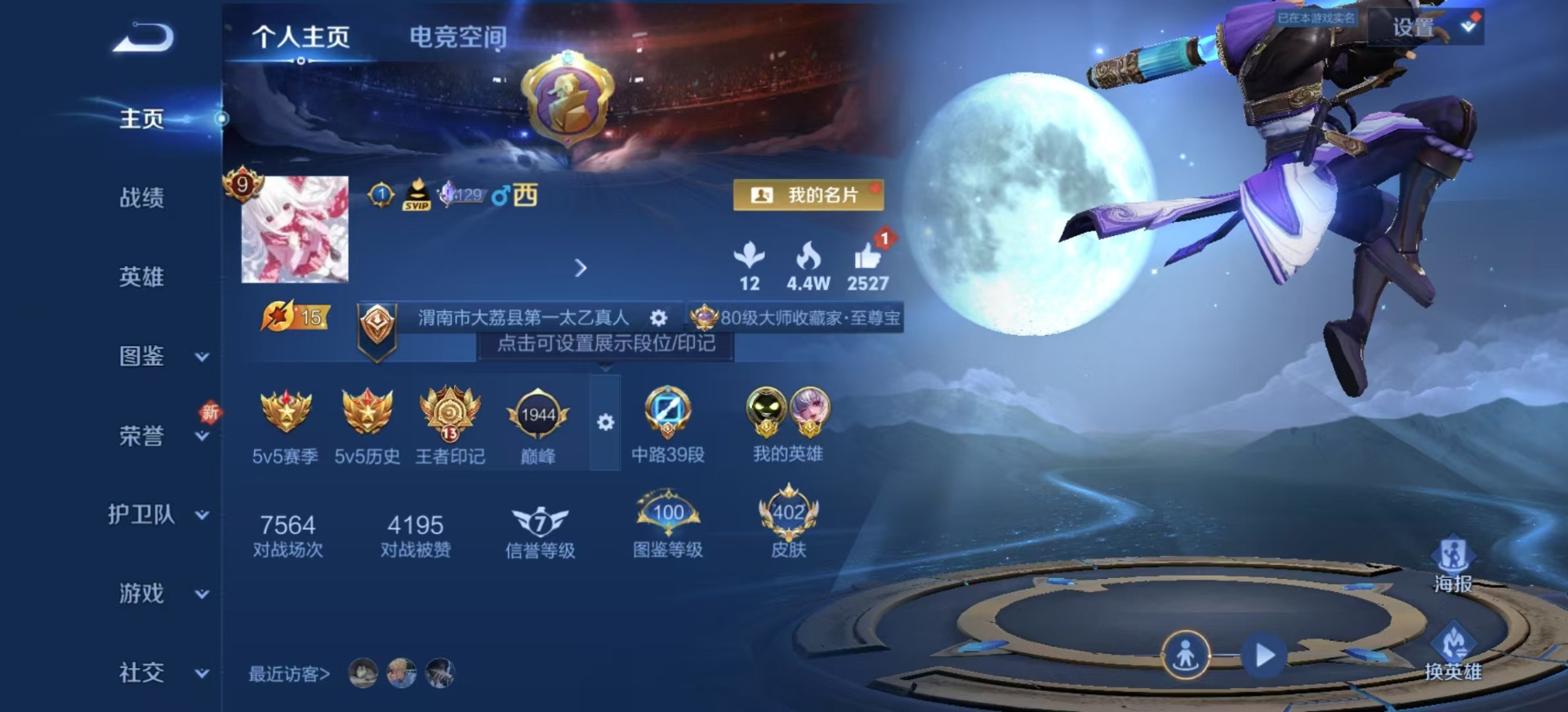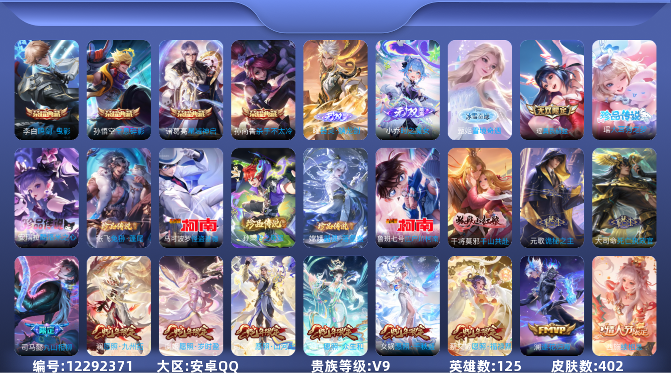 [12292371]V9 4典藏 4无双 7珍品传说 32传说 125英雄 402皮肤 可修改实名 优质装备:杀手不太冷,鸣剑·曳影,全息碎影(猴子典藏),星域神启(倪克斯贼亮),真我赫兹(瑶)(瑶无双),小乔时之魔女(小乔无双),雪境奇遇-甄姬,器灵·螭龙剑,江户川柯南,怪盗基德,器灵·落星盏,酷洛米之心,大耳狗之梦,久胜战神,炽阳神光,一念神魔,云霓雀翎,地狱火,音你心动-小乔,时之恋人-刘备(电焊工),淬星耀世,末日机甲-孙策,音你闪耀(rap皮),浮生妄,澜逐花归海,牧神诗旅,玄雷天君,诡秘之主,千山共赴,涂山容容 珍品传说:时之奇旅-孙策,兔狲·蓬尾 传说皮:死亡执政官,九山相柳,铠冥王哈迪斯,续相思,祥瑞亨通,幻光神枪 珍宝阁皮:妄想食味,蔷薇恋人 限定皮:愿照·九州拓(澜年限),愿照·福禄聚(蔡文姬年限),愿照·岁时盈(虞姬年限),愿照·山河定(司空震年限),愿照·众生和(妲己年限),愿照·千秋盛(女娲年限),逐霄战戟,鸣野蒿,至尊宝,白鹤梁神女,魔法小厨娘,时雨天司(水龙头),神威(电光马子),山海·碧波行(瑶年限),高山流水,降魔,五谷丰年,冰锋战神,御风骁将(吕布年限),逐梦之翼,烈魂,逐梦之音,辉光之辰,孙行者,猪悟能,引擎之心,启示之音,时之奇旅-妲己,神器·万象笔,天降福星 史诗皮:赞萌露比,鸭鸭历险记-刘禅,苍鳞隐世,器灵·浮梦炉,绮世丹青,化蝶舞,星界战将,谪仙醉月,龙之律动,雪豹·霜爪,藏狐·褐绒,布丁狗之誓,小牛鸭,石田雨龙,百相守梦-周瑜,戍鼓铭心,茶境仙,幻珠鲛人,破空之剑,涂山红红,东方月初,蒙犽顽岩魄,芈月浮光幕影,琥珀纪元伽罗,蔬乡物语(鲁班七号),超元猎域,百相守梦-百里守约,百相守梦-黄忠,织梦人,守夜人,紫霞仙子,黄金分割率,特工魅影,千年之狐,江河有灵,雪夜绮愿(周瑜),魅语,高渐离燃音魔法,蒙恬荣光圣徽,无限星赏官,匿光破解者,冰冠公主,青蛇,偶像歌手,白蛇,百相守梦(关羽),龙骑士(小龙虾),末日机甲-吕布,猫狗日记-孙策,乱世虎臣,节奏热浪,修罗,女仆咖啡,摇滚巨星,水果甜心,绅士熊喵,天才门将,星夜王子,心灵骇客,功夫厨神,德古拉伯爵,暗隐猎兽者,幽灵船长,鬼剑武藏,心灵战警,乐园奇幻夜,舞动绿茵,地狱岩魂,纤云弄巧,繁星吟游(呼啦呼啦),缤纷独角兽,乘风破浪,逐浪之夏,水晶猎龙者,金属风暴,原初追逐者,圣诞狂欢,鹰眼统帅