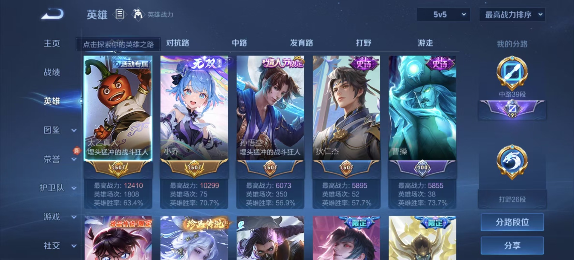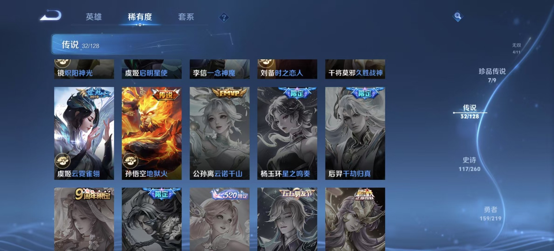 - PX_2083827-贵族等级: V6 英雄数: 121 皮肤数: 131 传说皮: 一念神魔,云霓雀翎 限定皮: 李小龙,飞衡,五谷丰年,怒海麟威
