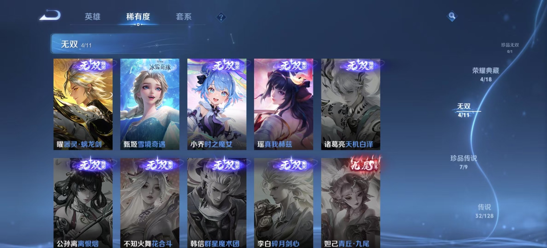- PX_2098023-Q/永恒钻石/47皮肤/65英雄/0典藏/0珍品无双/0无双/0珍品传说/4传说/20史诗/7稀有英雄 【4 传说皮肤】逐花归海 澜,诗剑行 李白,愿照·岁时盈 虞姬,云诺千山 公孙离, 【20 史诗皮肤】蔬乡物语 鲁班七号,紫霞仙子 露娜,奇遇舞章 艾琳,猫狗日记 大乔,无限星赏官 公孙离,黄金分割率 诸葛亮,女仆咖啡 妲己,晚萤 娜可露露,鸭鸭历险记 刘禅,魔术师 狄仁杰