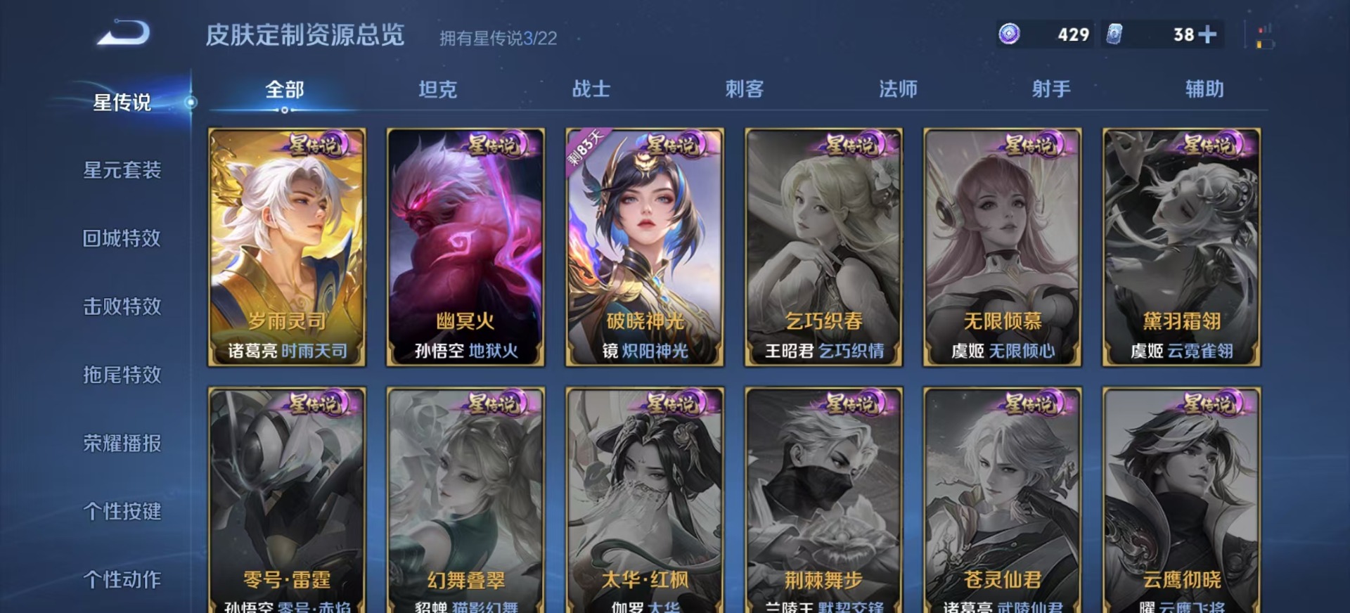 刘备时之恋人,铠冥王哈迪斯,赵云淬星耀世,干将莫邪久胜战神,小乔音你心动,李信一念神魔,孙尚香音你闪耀,孙策末日机甲,庄周牧神诗旅,镜炽阳神光,裴擒虎祥瑞亨通,夏洛特浮生妄,西施续相思,嬴政玄雷天君,澜逐花归海,虞姬云霓雀翎,云缨幻光神枪
