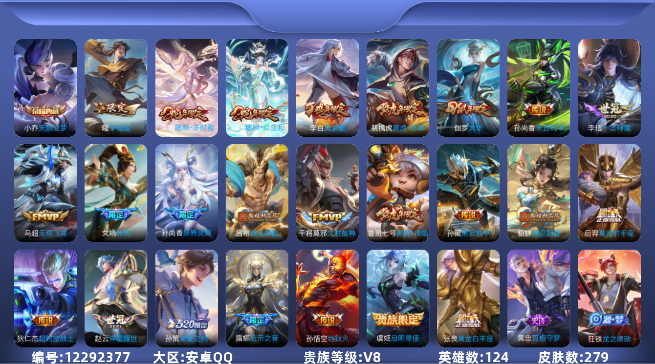 [12292377]V8 1典藏 24传说 124英雄 279皮肤 可修改实名 优质装备:天鹅之梦(小乔典藏),黄金射手座,黄金白羊座,久胜战神,一念神魔,末日机甲-孙尚香(绿蚂蚱),地狱火,李逍遥,淬星耀世,超时空战士-狄仁杰,遇见胡旋,末日机甲-孙策,挚爱之约,无双飞将,遇见神鼓 珍宝阁皮:妄想食味,优雅恋人 限定皮:愿照·岁时盈(虞姬年限),愿照·众生和(妲己年限),至尊宝,凤求凰(白切鸡),太华(伽罗年限),异界灵契(白毛香),傲雪梅枪,补天,寅虎·展翼(孙膑年限),神威(电光马子),飞衡(韩信年限),玄嵩(庄周年限),至美·乘鲤谣,高山流水,五谷丰年,青龙志(铠年限),游园惊梦,梁祝,御风骁将(吕布年限),岱宗(典韦年限),李小龙,朱雀志(守约年限),辉光之辰,如梦令-后羿,霸王别姬-项羽,孙行者,猪悟能,一生所爱,青春决赛季,神奇女侠,匿光追影者,女儿国国王,寅虎·御盾(廉颇年限),寅虎·瑞焰(虎皮蛋子),寅虎·心曲(虎婆),寅虎·赤拳(老虎年限),启示之音,山海·玄木吟(马可年限) 史诗皮:化蝶舞,龙之律动,百相守梦-黄忠,紫霞仙子,白龙吟,黄金分割率,特工魅影,千年之狐,永昼,江河有灵,末日机甲-莱西奥,魅语,冰冠公主,偶像歌手,晚萤,龙骑士(小龙虾),末日机甲-吕布,猫狗日记-孙策,修罗,女仆咖啡,摇滚巨星,水果甜心,天才门将,星夜王子,时之奇旅-安琪拉,功夫厨神,德古拉伯爵,暗隐猎兽者,幽灵船长,鬼剑武藏,暗渊魔法,心灵战警,乐园奇幻夜,舞动绿茵,拒霜思,缤纷独角兽,乘风破浪,逐浪之夏,水晶猎龙者,曙光守护者,箭羽风息,金属风暴,圣诞狂欢,鹰眼统帅,黎明之约,雪上飞焰,奇遇舞章,寅虎·御盾,无心,未来纪元-赵云