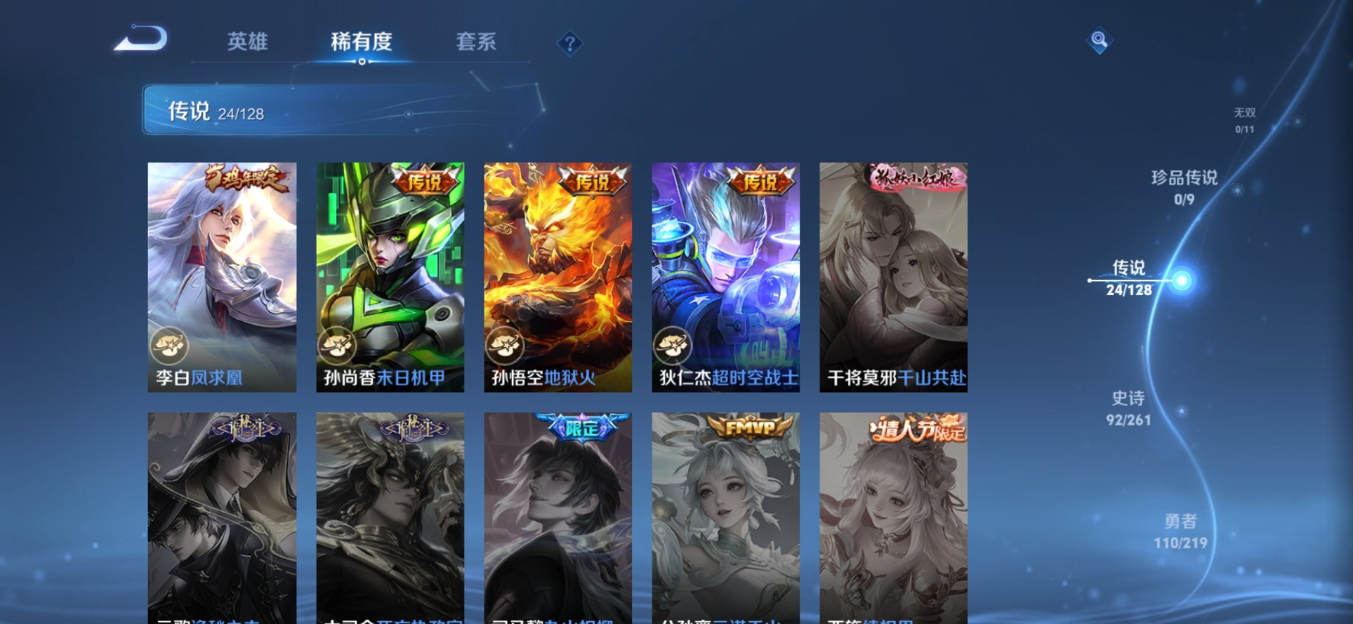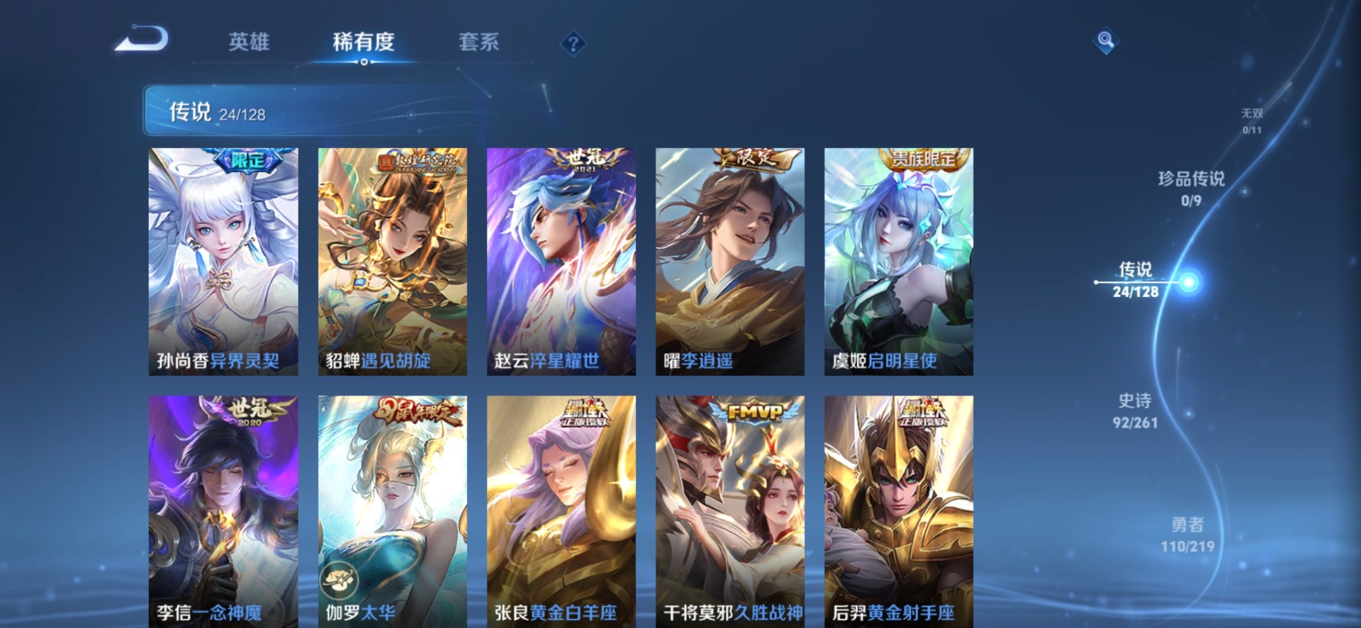 - PX_2079515-24 苹果QQ/至尊星耀/355皮肤/124英雄/2典藏/0珍品无双/0无双/2珍品传说/31传说/114史诗/8稀有英雄 【2 珍品传说】大耳狗之梦 瑶,怪盗基德 马可波罗, 【2 典藏皮肤】银白咏叹调 铠,弑枪猎影 韩信, 【31 传说皮肤】鹤归松栖 云缨,启明星使 虞姬,齐天大圣 孙悟空,神器·狴犴令 狄仁杰,深海之息 马可波罗,凤求凰 李白,仲夏夜之梦 貂蝉,惊梅引