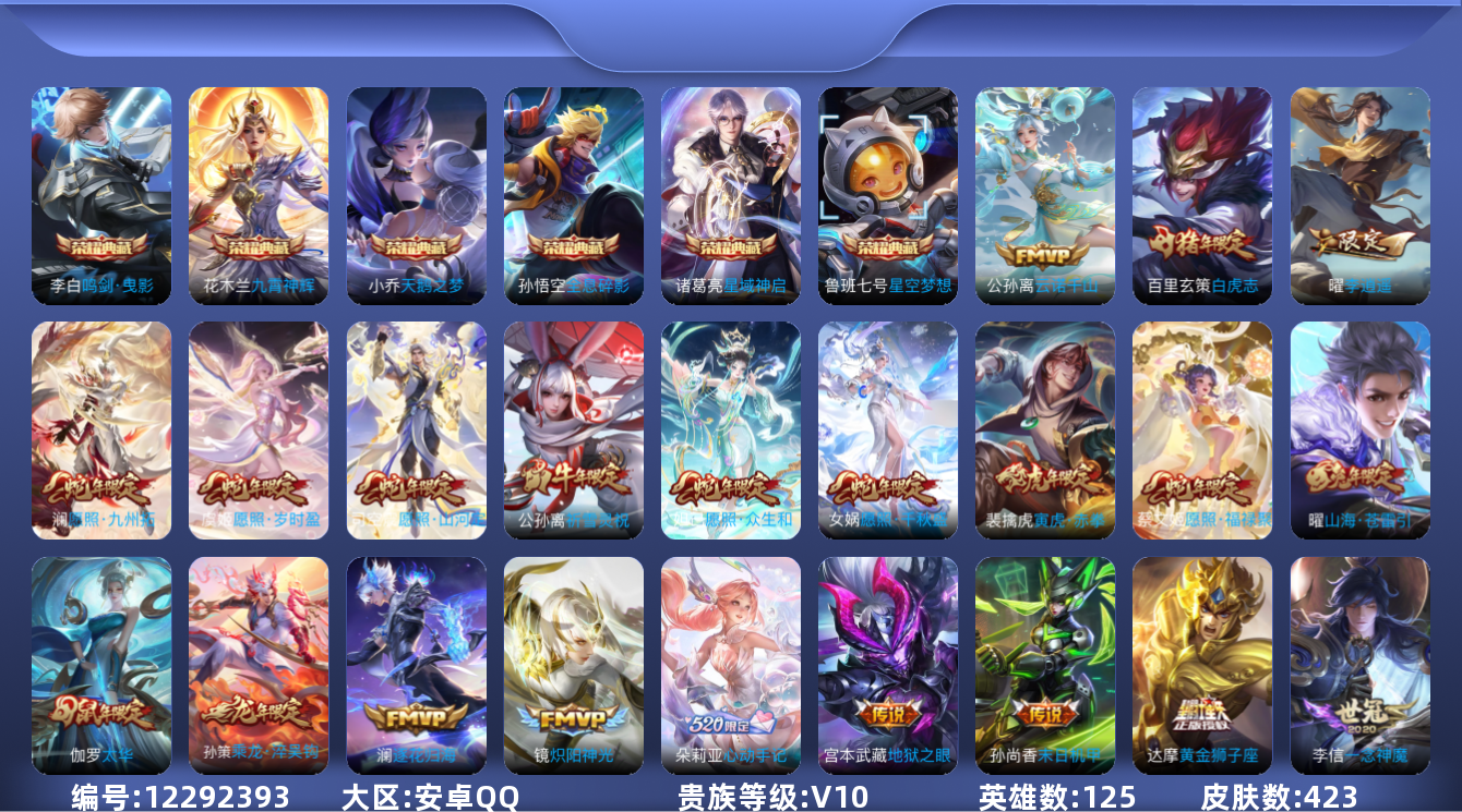 [12292393]V10 6典藏 60传说 125英雄 423皮肤 可修改实名 优质装备:天鹅之梦(小乔典藏),星空梦想(太空人),鸣剑·曳影,全息碎影(猴子典藏),星域神启(倪克斯贼亮),九霄神辉(木兰典藏),黄金狮子座,黄金射手座,云鹰飞将(小将军),绛天战甲(鸡嘴战神),猫影幻舞,久胜战神,炽阳神光,一念神魔,云霓雀翎,末日机甲-孙尚香(绿蚂蚱),地狱火,仲夏夜之梦(大飞蛾),音你心动-小乔,零号·赤焰,地狱之眼,飞鸢探春,音你心动-周瑜,李逍遥,乞巧织情,时之恋人-刘备(电焊工),游龙清影(小青龙),淬星耀世,遇见胡旋,末日机甲-孙策,挚爱之约,碎云,山海·苍雷引(电光曜子),追逃游戏(亚瑟),追逃游戏(安琪拉),妄想实况,霜月吟,澜逐花归海,艾琳觅芳踪,朵莉亚心动手记 传说皮:乘龙·淬吴钩(孙策年限),云诺千山,星之鸣奏,幻光神枪 珍宝阁皮:妄想食味,优雅恋人,蔷薇恋人,玩趣恶龙 限定皮:愿照·九州拓(澜年限),愿照·福禄聚(蔡文姬年限),愿照·岁时盈(虞姬年限),愿照·山河定(司空震年限),愿照·众生和(妲己年限),愿照·千秋盛(女娲年限),逐霄战戟,陌上桑,鸣野蒿,白虎志(电光耗子),凤凰于飞,太华(伽罗年限),武陵仙君(小桃花),异界灵契(白毛香),傲雪梅枪,补天,寅虎·展翼(孙膑年限),前尘镜,绯月行,白鹤梁神女,白晶晶,时雨天司(水龙头),神威(电光马子),高山流水,五谷丰年,武圣,梁祝,御风骁将(吕布年限),天狼狩猎者,逐梦之星,天狼溯光者,祈雪灵祝(雪兔子),李小龙,逐梦之影,朱雀志(守约年限),如梦令-后羿,霸王别姬-虞姬,默契交锋-兰陵王,默契交锋-花木兰,真爱至上,孙行者,猪悟能,一生所爱,青春决赛季,乒乒小将,蜜橘之夏,匿光追影者,女儿国国王,寅虎·瑞焰(虎皮蛋子),寅虎·心曲(虎婆),寅虎·赤拳(老虎年限),时之祈愿-云中君,玉兔公主,启示之音,神器·万象笔,山海·玄木吟(马可年限) 史诗皮:苍鳞隐世,器灵·浮梦炉,糖绘人间,化蝶舞,星界战将,灵蛊蚀心,海诺心动手记,涂山红红,东方月初,蒙犽顽岩魄,蔬乡物语(鲁班七号),百相守梦-黄忠,遇见神鹿,紫霞仙子,电玩小子(小书包),黄金分割率,特工魅影,千年之狐,永昼,电玩·爆裂旋风,浮梦罗烟,江河有灵,百解令(蒙犽),高渐离燃音魔法,蒙恬荣光圣徽,偶像歌手,龙骑士(小龙虾),魅语,晚萤,冰冠公主,末日机