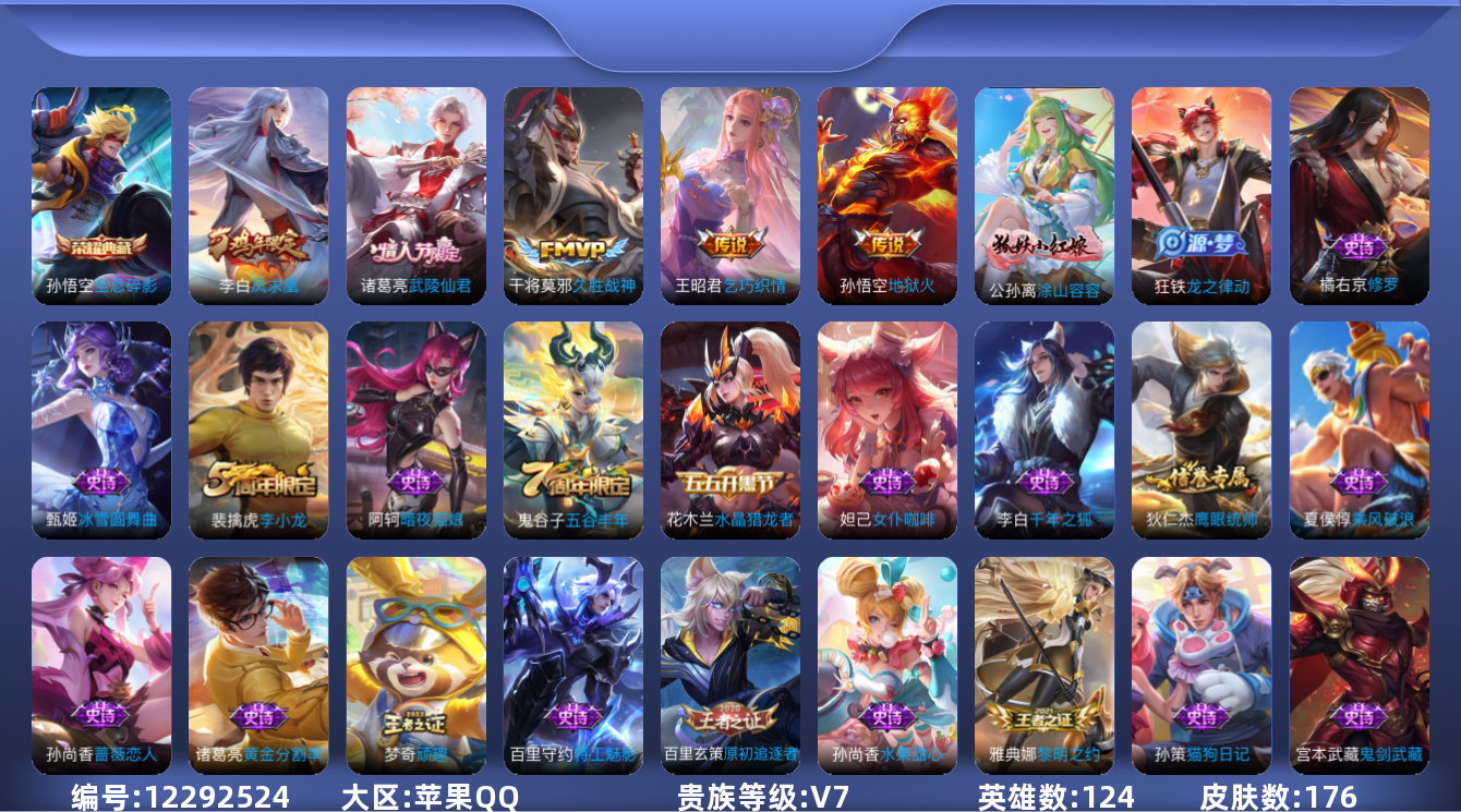 - [12027192]V9 3典藏 20传说 124英雄 297皮肤 可修改实名 优质装备:无限飓风号(高达),大秦宣太后,全息碎影(猴子典藏),黄金狮子座,黄金射手座,云鹰飞将(小将军),黄金白羊座,久胜战神,炽阳神光,一念神魔,末日机甲-孙尚香(绿蚂蚱),地狱之眼,时之恋人-刘备(电焊工),超时空战士-狄仁杰,末日机甲-孙策 珍宝阁皮:万物之道,蔷薇恋人,玩趣恶龙 限定皮:至尊宝,白虎志(电光耗子),凤求凰(白切鸡),梅西,武陵仙君(小桃花),傲雪梅枪,时雨天司(水龙头),神威(电光马子),飞衡(韩信年限),瑞麟志(木兰年限),匿光决锋者,怒海麟威,五谷丰年,青龙志(铠年限),武圣,梁祝,天狼狩猎者,虎魄,天狼绘梦者,李小龙,朱雀志(守约年限),圣诞老人,默契交锋-花木兰,一生所爱,大圣娶亲,青春决赛季,冰霜恋舞曲,神奇女侠,匿光追影者,女儿国国王,玉兔公主,深海之息(深海大菠萝) 史诗皮:化蝶舞,茶境仙,战舞者,百相守梦-黄忠,遇见神鹿,紫霞仙子,苍穹之光,电玩小子(小书包),黄金分割率,特工魅影,千年之狐,永昼,魅语,无限星赏官,冰冠公主,偶像歌手,暗夜猫娘,龙骑士(小龙虾),末日机甲-吕布,猫狗日记-孙策,猫狗日记-大乔,时之恋人-孙尚香,乱世虎臣,节奏热浪,修罗,摇滚巨星,水果甜心,天才门将,星夜王子,心灵骇客,功夫厨神,德古拉伯爵,暗隐猎兽者,幽灵船长,鬼剑武藏,心灵战警,乐园奇幻夜,天秀·启明,舞动绿茵,地狱岩魂,繁星吟游(呼啦呼啦),拒霜思,缤纷独角兽,乘风破浪,逐浪之夏,水晶猎龙者,曙光守护者,箭羽风息,唤灵魅影,金属风暴,原初追逐者,圣诞狂欢,圣诞恋歌,鹰眼统帅,王者之锤,赏金猎手