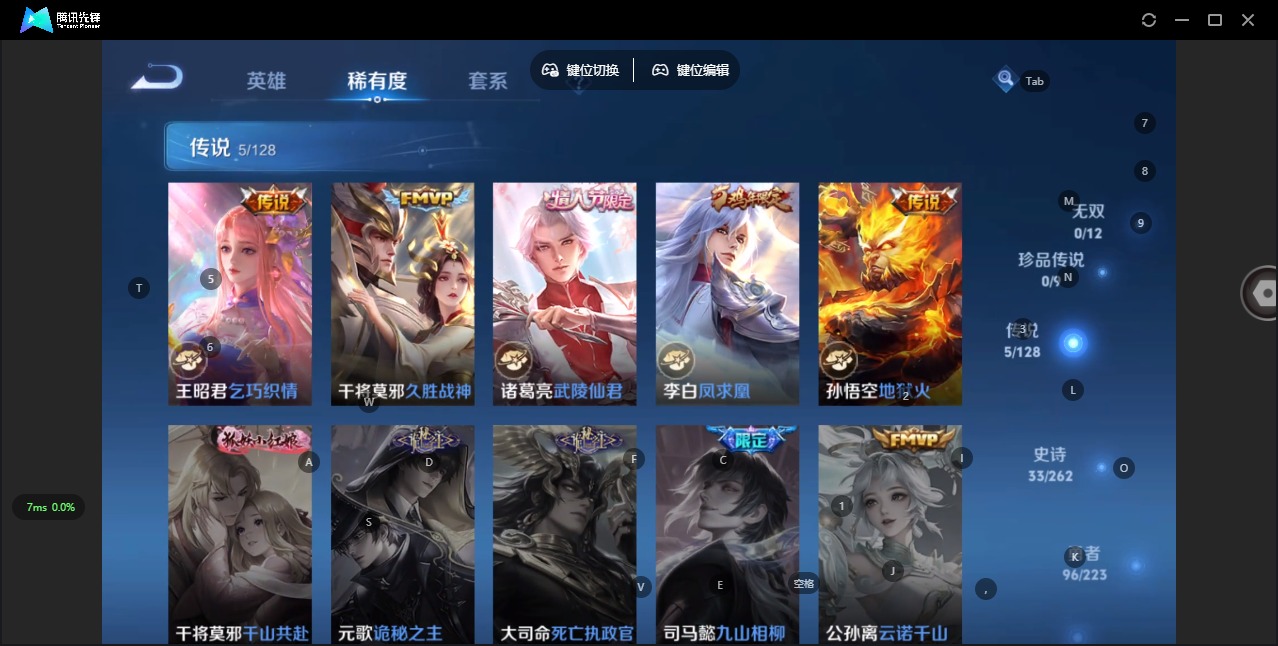 - PX_2093182-54 安卓QQ/至尊星耀/248皮肤/125英雄/2典藏/0珍品无双/0无双/1珍品传说/20传说/63史诗/9稀有英雄 【1 珍品传说】怪盗基德 马可波罗, 【2 典藏皮肤】鸣剑·曳影 李白,弑枪猎影 韩信, 【20 传说皮肤】启明星使 虞姬,逐花归海 澜,云鹰飞将 曜,齐天大圣 孙悟空,诗剑行 李白,浮生妄 夏洛特,记忆之芯 公孙离,地狱之眼 宫本武藏,炽阳神光 镜,霜月