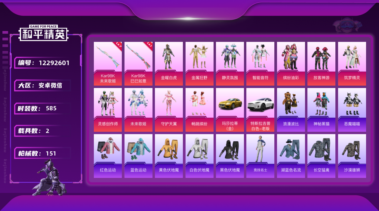 [12292601]11粉装 2特效枪 2载具 14印记 可二次 可修改实名 优质装备:玛莎拉蒂Ghibli(金),特斯拉Model X(珍珠白),放客神游,金曜白虎,金属狂野,静灵氛围,智能音符,缤纷油彩(猪妹猪脸妹),Kar98K未来歌姬,七级Kar98K-未来歌姬,Kar98K-巳巳如意 热门装扮:筑梦精灵,灵感创作师,畅跳缤纷,未来歌姬,守护天翼,神秘黑猫,恶魔喵喵,浪漫波比 一级特效枪:一级Kar98K-巳巳如意 紫色装扮:SS30特训套装,SS31特训套装,SS33特训套装,青涩时光,旭日情侣,SS23特训,田园牧歌,轻风白浪,SS22特训,摩登艾咪,夏日音浪,北国孤狼,千禧之恋,圣诞大吉,坚韧舞者,夜莺强袭者,幻世战舞者,幻影武者,凛冬战士,SS3特训,SS5特训,冷焰舞者,军械专家,冰原使者,,冰川特警,娇憨猪猪,SS16特训,电音精灵,天籁歌者,瑞龙福将,团圆交子,SS17特训,SS14特训,青春冒险家,SS15特训,鹤发童颜,SS21特训,甜心亚梦,虚音幻奏,SS20特训,灵幻魔术师,萌趣咩咩,SS18特训,智慧隐士,飞驰魅影,音速流光,SS19特训,龙的传人,飞行日记,魅力单车,鹤鸣,麻辣教官,黄色伏地魔,黑色伏地魔,龙腾端午,龟仙人,都市魅力,长空猛禽,雪山征服者,雪山精英,霓虹街区,探宝勇士,炫蓝之夏,湖蓝色名流,滨海假日,滨海厨神,熔岩使者,牛气冲天,牛气满满,深蓝色名流,格斗先锋,极速红龙,柠萌假日,涂山之恋,沙漠毒蛇,沙漠雄狮,绮丽涂鸦,红色运动,荣耀,荧惑魅影,蓝彩潮人,蓝色运动,虎虎生威吉莉,街头潮人,超能勇士,狂沙舞者,白色伏地魔,甜蜜熊情侣,疯狂小兔子,白熊同盟,破晓战魂,破蛋小黄鸡,神秘领域,福星高照,空岛之星,空投萌叽,竞技勇士朋克,竞技达人朋克,粉雾星云,SS28特训,暗影刺翼,纯真浪花,巳巳如意,竞技名士,街头风暴,热情海星,惊鸿侠骨,神气柴柴,懵萌河马,SS24特训(SS24特训套装),萤火魅影(套装-荧惑魅影),SS25特训,锦衣飞扬,焰鹰斗篷,幻羽潜行,幽夜迷踪,SS27特训,SS26特训,春光漫游,快闪甜心,精神漫游,SS7特训,SS8特训,众神之王,爱神,智慧之神,SS9特训,舞夜骑士,白月香洋装,玲珑飞花,SS6特训,风华少年志,SS10特训,白虎圣者,原初圣火,逆风勇士,SS12特训,SS13特训,PEC最牛战神,SS