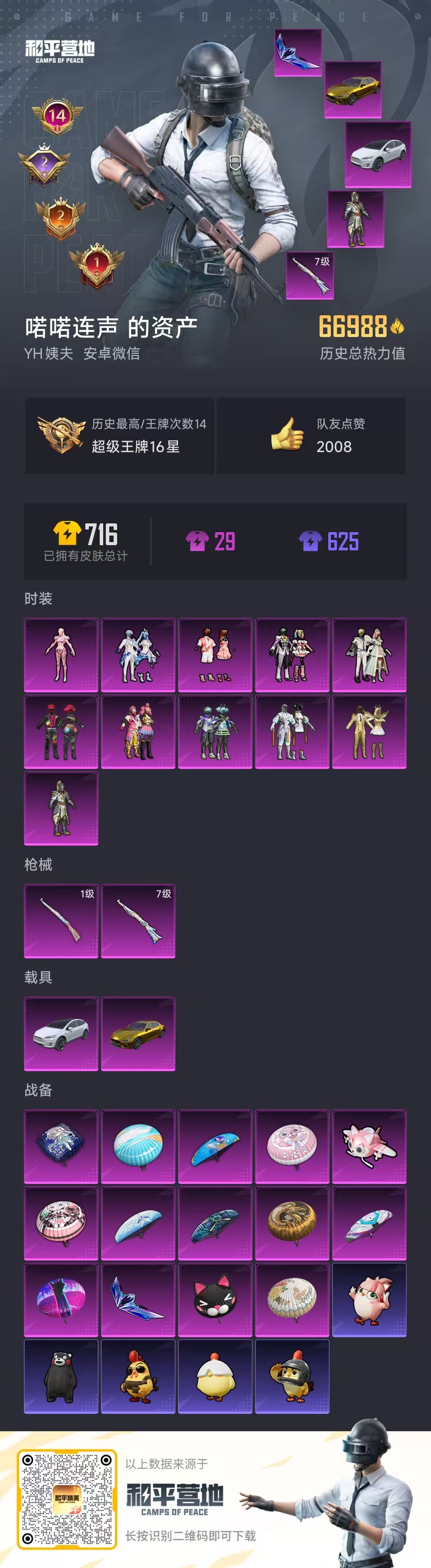 - PX_2090733- 安卓手Q-0王牌印记-3粉装-1特效枪-3载具-23541热力值-42套装-69枪皮-0卓越印记-0传奇印记 【3粉装】,宝贝奶油派,星穹咏叹调,山涧鹿灵 【1特效枪】Kar98K-巳巳如意-5级 【1稀有紫装】,暗夜魅影, 【3稀有载具】,宝马M4(圣保罗黄),兰博基尼URUS(明艳黄),帕加尼imola(光影红), 【1僚机】,空客H135-蔚蓝之翼, 【42稀有时装